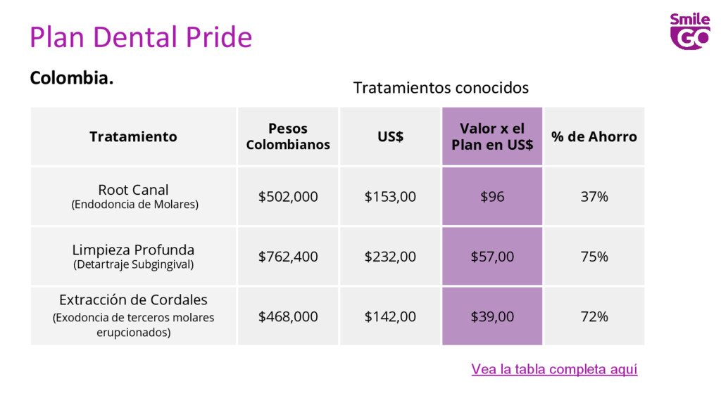 el Plan en US$ % de Ahorro Root Canal (Endodoncia de Molares) $502,000 $153,00 $96 37% Limpieza Profunda (Detartraje Subgingival) $762,400 $232,00 $57,00 75% Extracción de Cordales (Exodoncia de terceros molares erupcionados) $468,000 $142,00 $39,00 72% Vea la tabla completa aquí Tratamientos conocidos