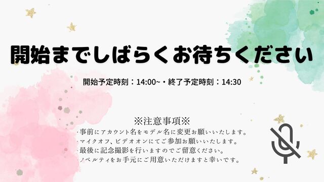 ※注意事項※ ・事前にアカウント名をモデル名に変更お願いいたします。 ・マイクオフ、ビデオオンにてご参加お願いいたします。 ・最後に記念撮影を行いますのでご留意ください。 ・ノベルティをお手元にご用意いただけますと幸いです。 開始予定時刻:14:00~・終了予定時刻:14:30