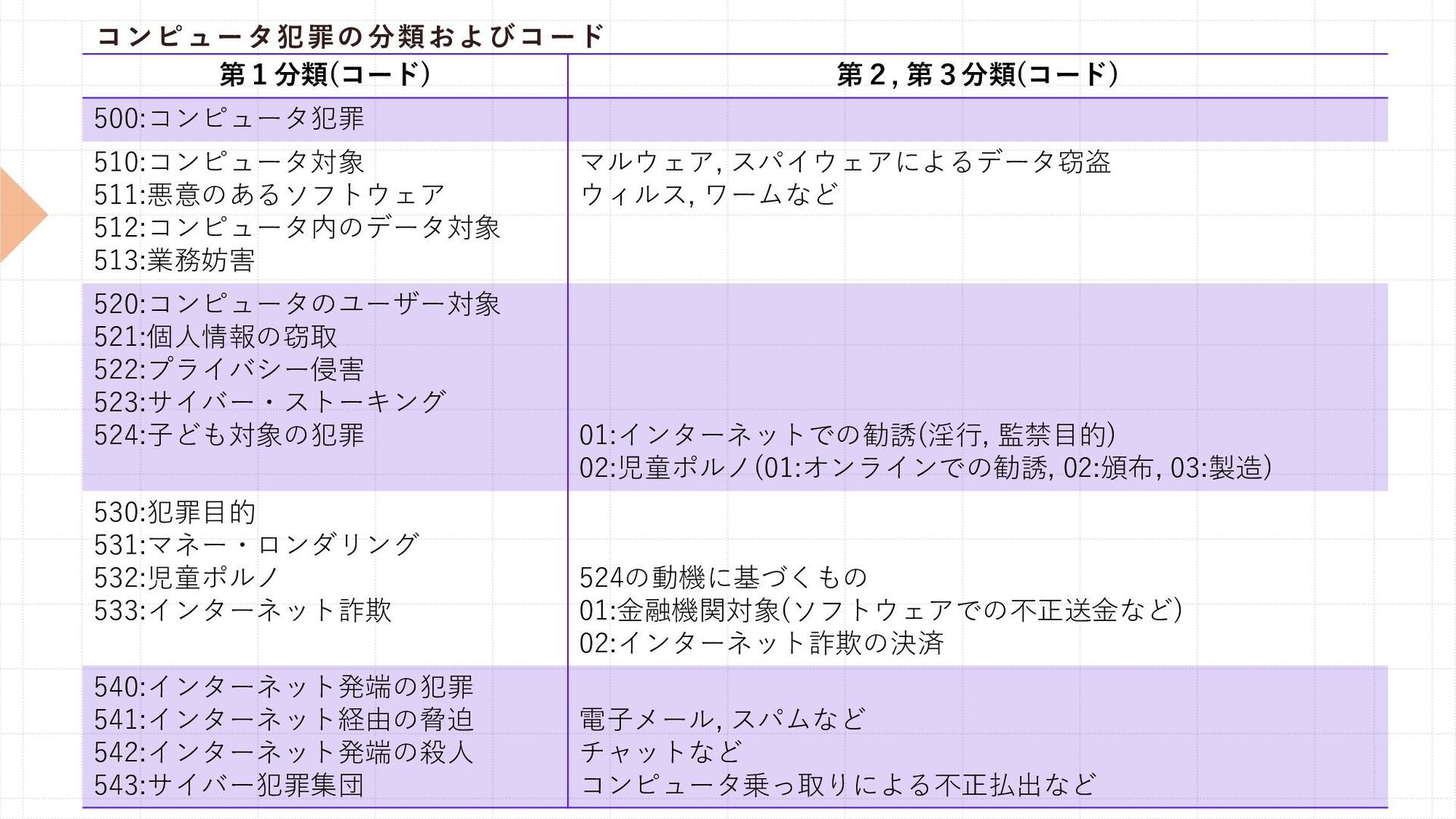 スパイウェアによるデータ窃盗 ウィルス, ワームなど 520:コンピュータのユーザー対象 521:個人情報の窃取 522:プライバシー侵害 523:サイバー・ストーキング 524:子ども対象の犯罪 01:インターネットでの勧誘(淫行, 監禁目的) 02:児童ポルノ(01:オンラインでの勧誘, 02:頒布, 03:製造) 530:犯罪目的 531:マネー・ロンダリング 532:児童ポルノ 533:インターネット詐欺 524の動機に基づくもの 01:金融機関対象(ソフトウェアでの不正送金など) 02:インターネット詐欺の決済 540:インターネット発端の犯罪 541:インターネット経由の脅迫 542:インターネット発端の殺人 543:サイバー犯罪集団 電子メール, スパムなど チャットなど コンピュータ乗っ取りによる不正払出など