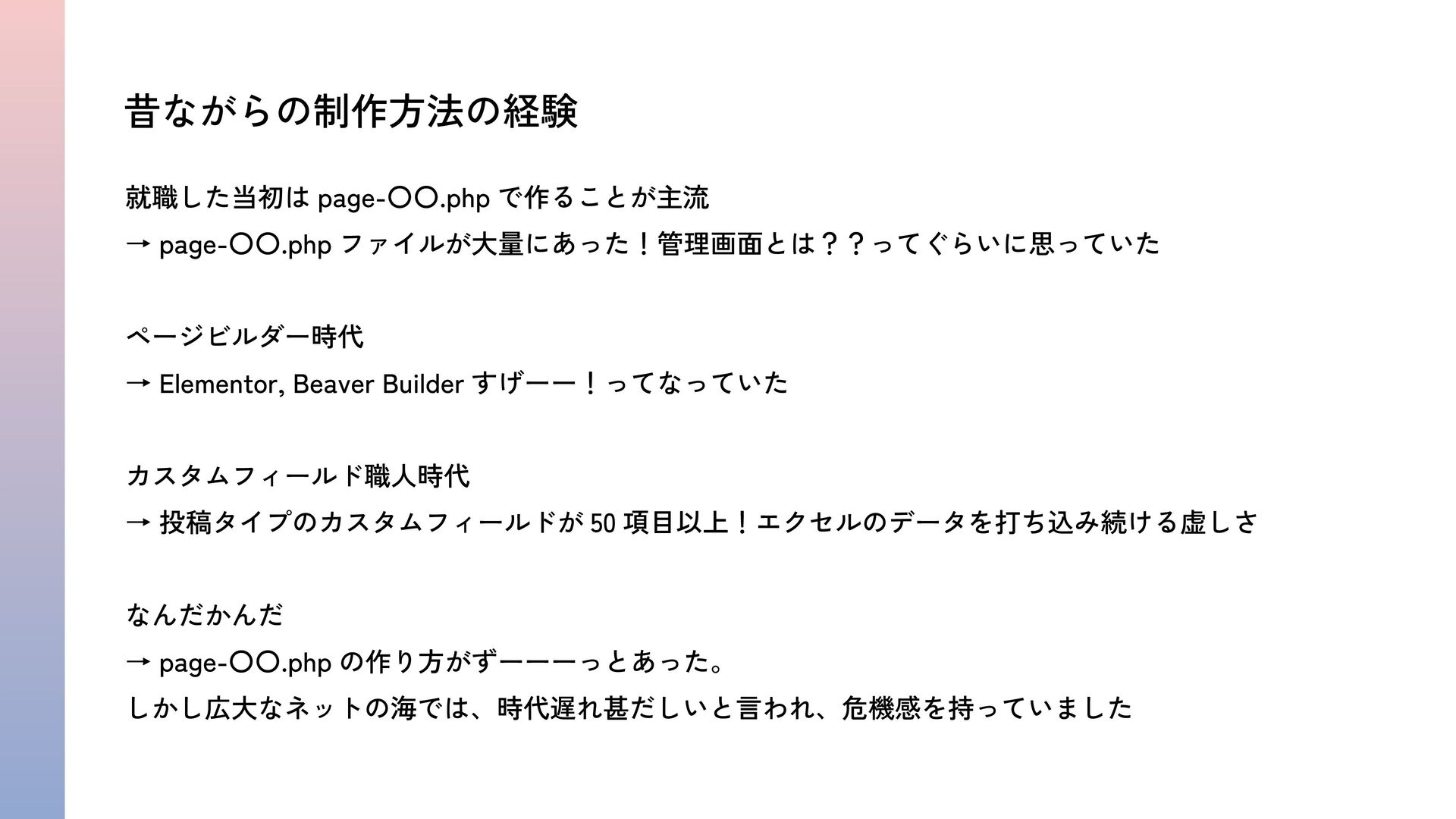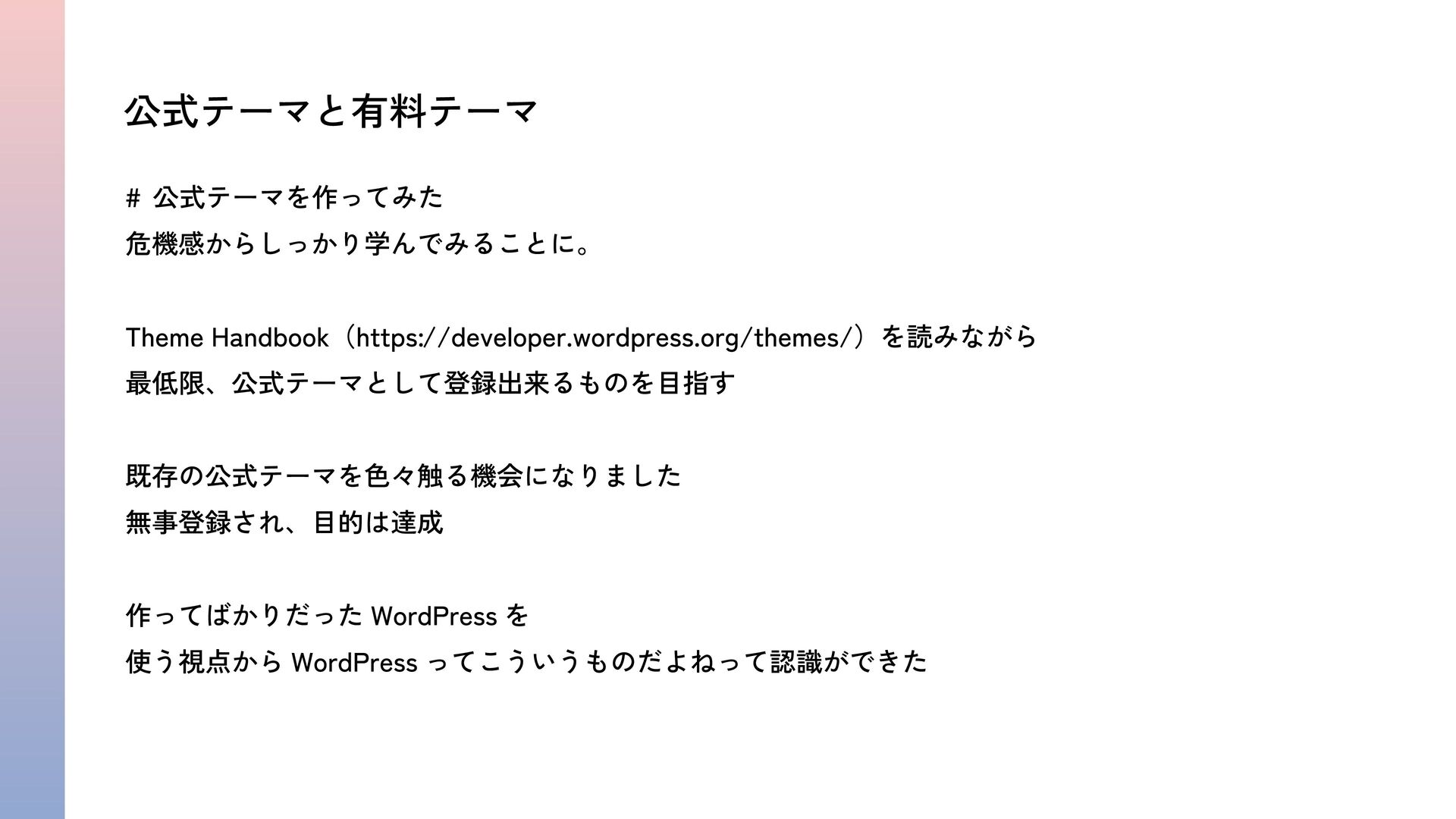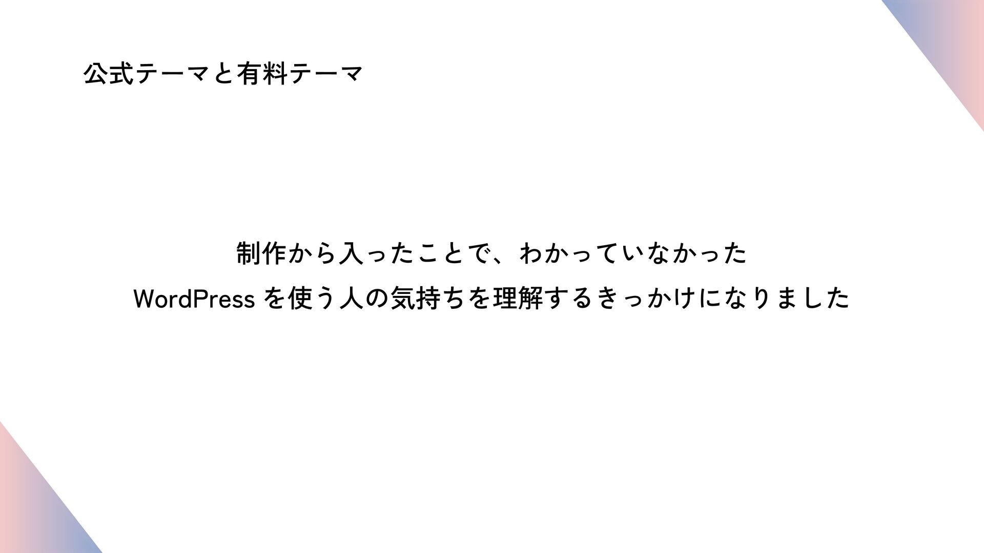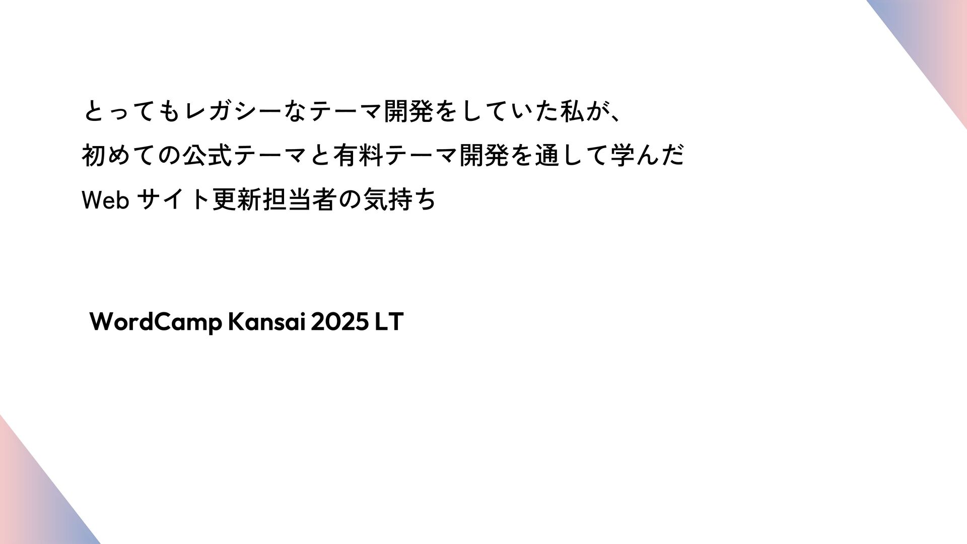 とってもレガシーなテーマ開発をしていた私が、初めての公式テーマと有料テーマ開発を通して学んだWebサイト更新担当者の気持ち / WordCamp Kansai 2025 / LT