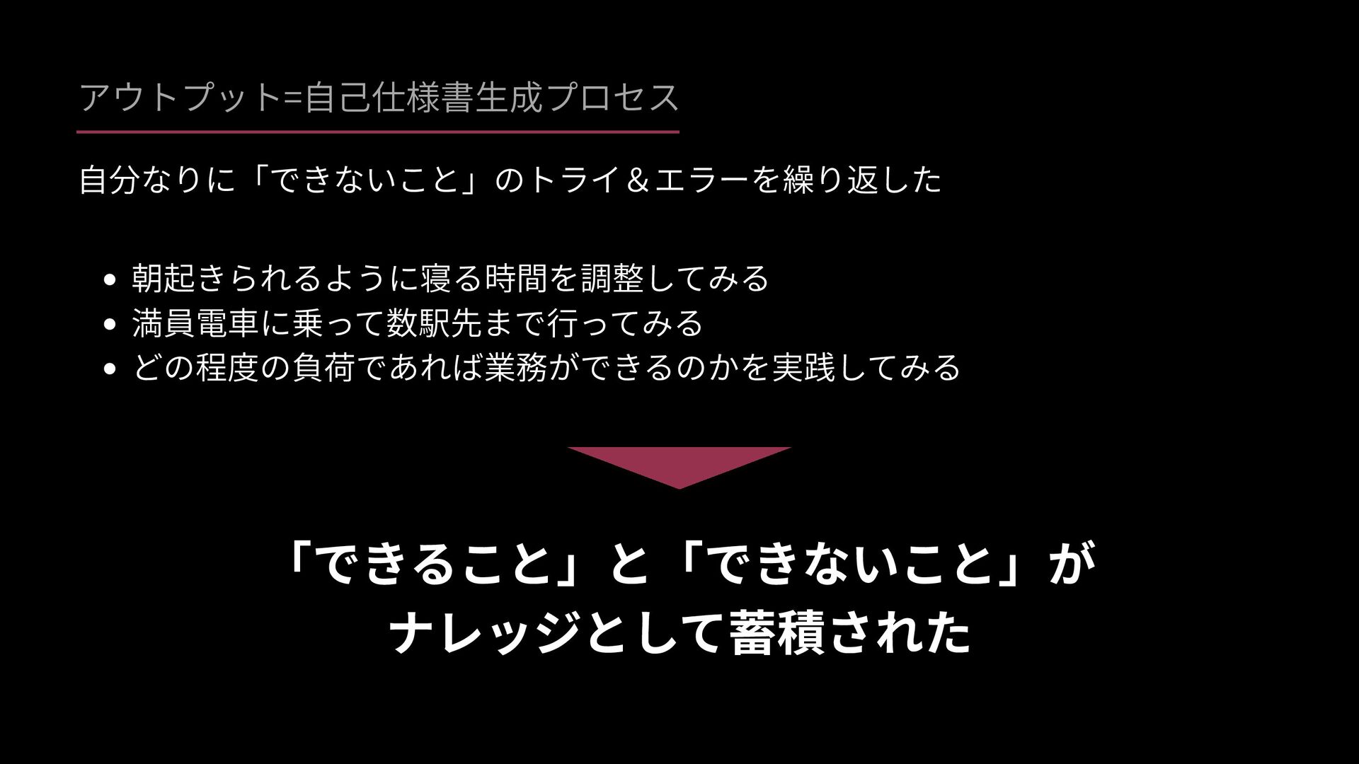 アウトプット=自己仕様書生成プロセス 自分なりに「できないこと」のトライ&エラーを繰り返した 朝起きられるように寝る時間を調整してみる 満員電車に乗って数駅先まで行ってみる どの程度の負荷であれば業務ができるのかを実践してみる 「できること」と「できないこと」が ナレッジとして蓄積された