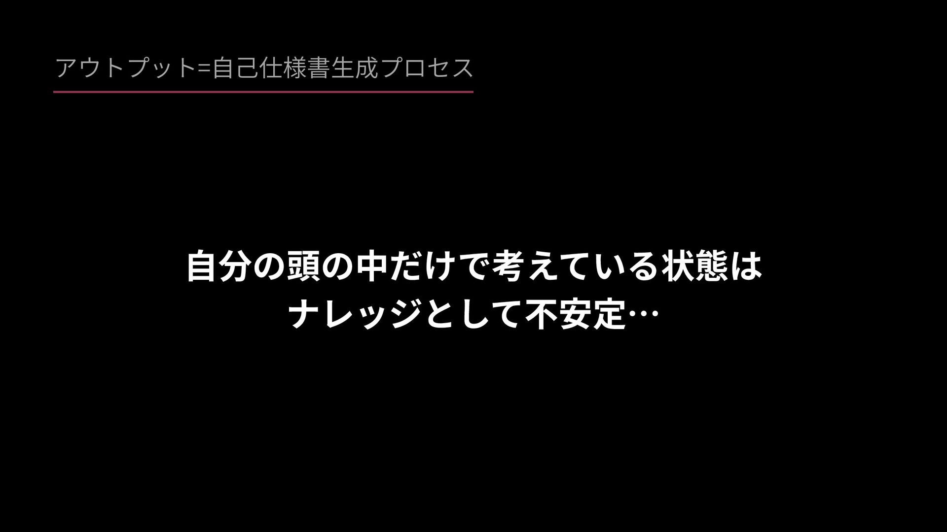 アウトプット=自己仕様書生成プロセス 自分の頭の中だけで考えている状態は ナレッジとして不安定…