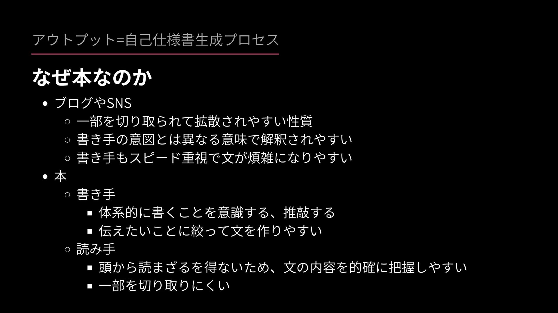 アウトプット=自己仕様書生成プロセス なぜ本なのか ブログやSNS 一部を切り取られて拡散されやすい性質 書き手の意図とは異なる意味で解釈されやすい 書き手もスピード重視で文が煩雑になりやすい 本 書き手 体系的に書くことを意識する、推敲する 伝えたいことに絞って文を作りやすい