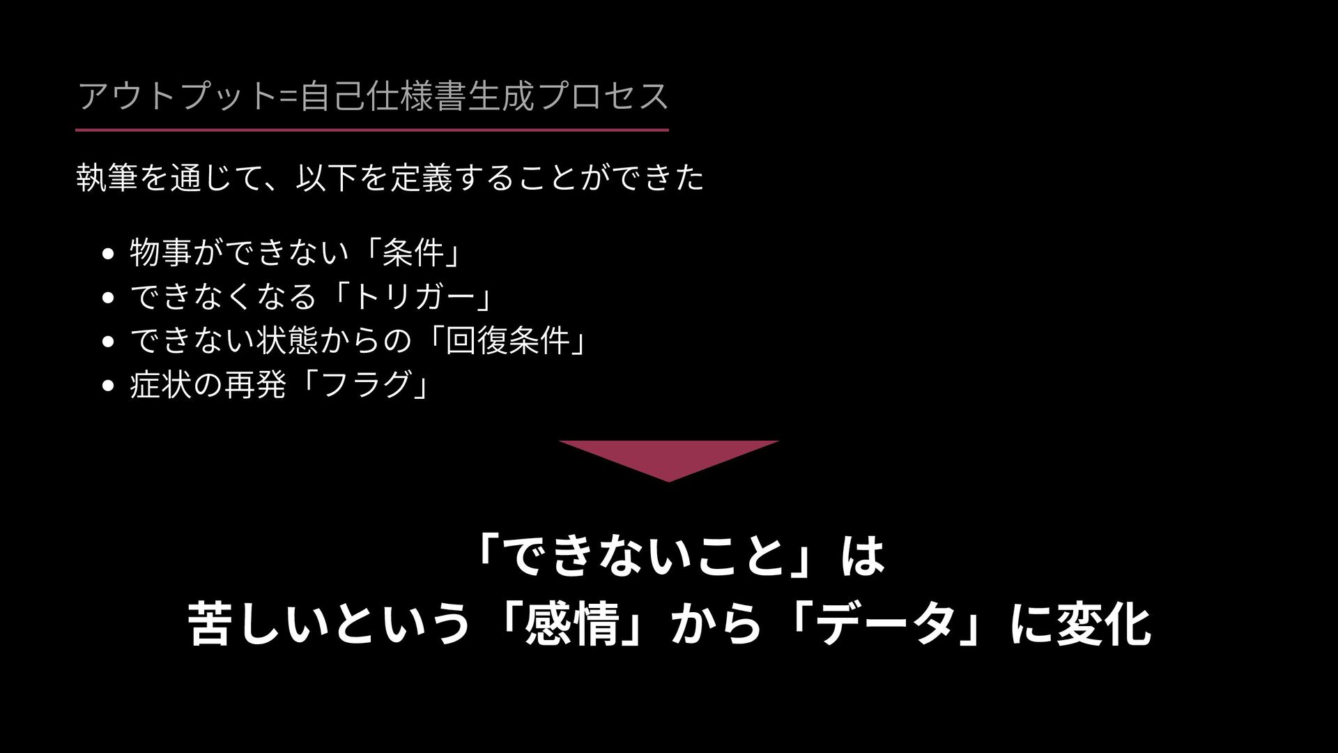 アウトプット=自己仕様書生成プロセス 執筆を通じて、以下を定義することができた 物事ができない「条件」 できなくなる「トリガー」 できない状態からの「回復条件」 症状の再発「フラグ」 「できないこと」は 苦しいという「感情」から「データ」に変化