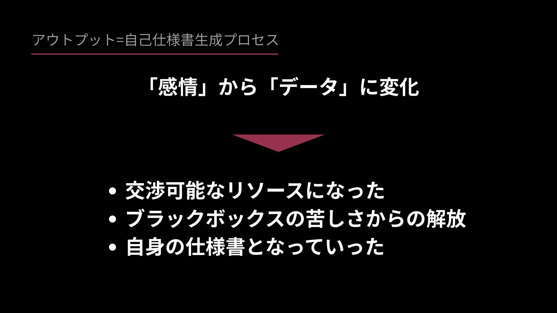 アウトプット=自己仕様書生成プロセス 「感情」から「データ」に変化 交渉可能なリソースになった ブラックボックスの苦しさからの解放 自身の仕様書となっていった