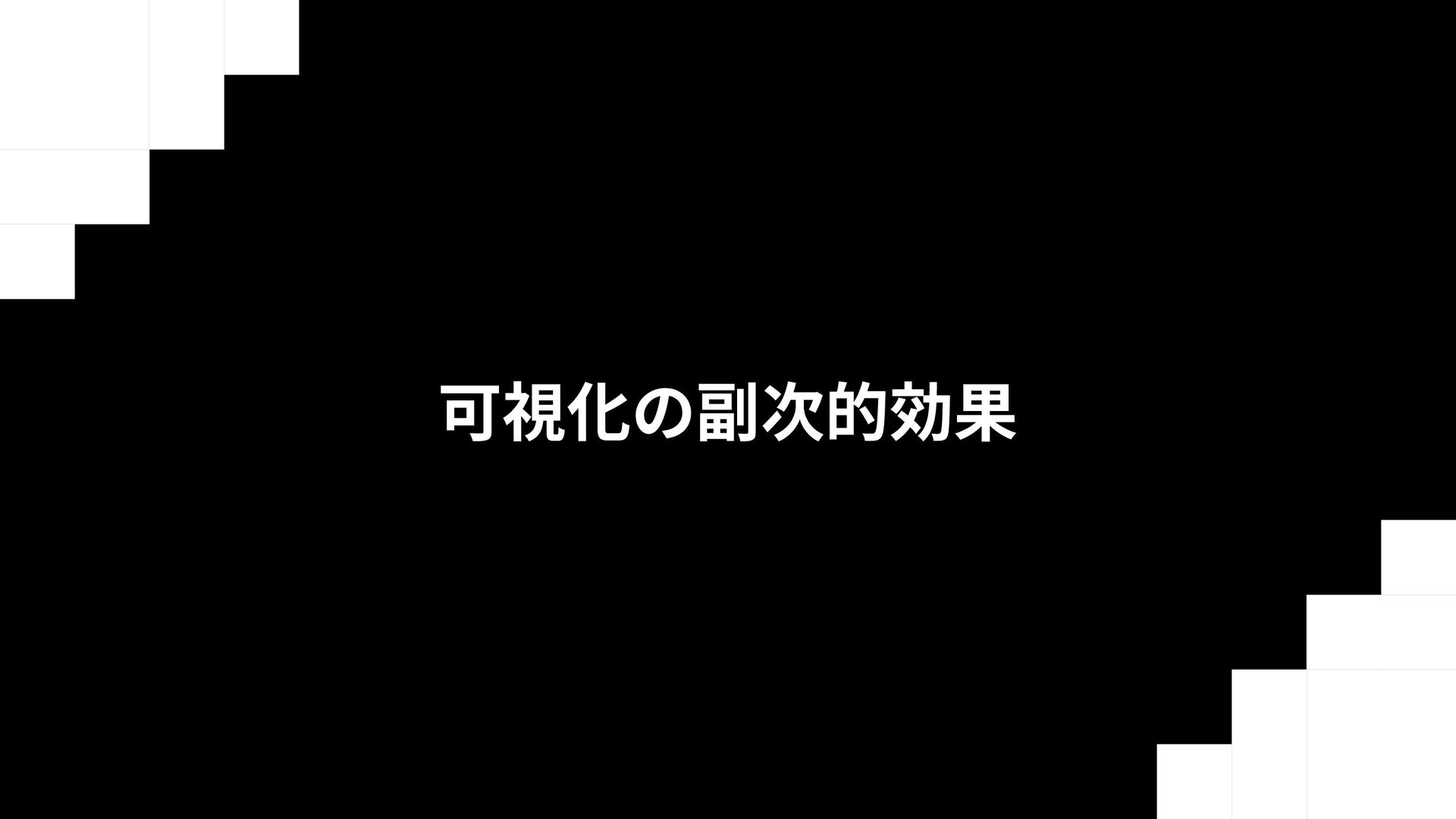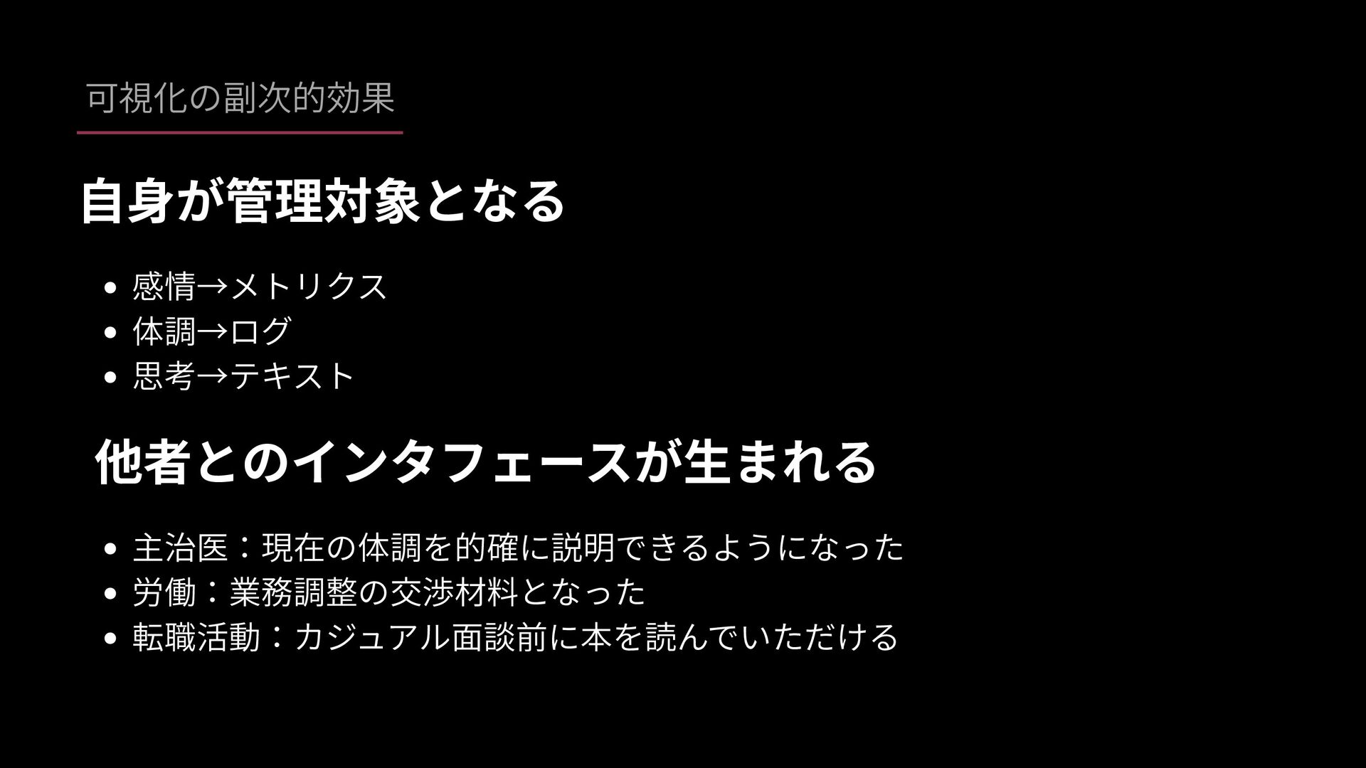 可視化の副次的効果 自身が管理対象となる 感情→メトリクス 体調→ログ 思考→テキスト 他者とのインタフェースが生まれる 主治医:現在の体調を的確に説明できるようになった 労働:業務調整の交渉材料となった 転職活動:カジュアル面談前に本を読んでいただける