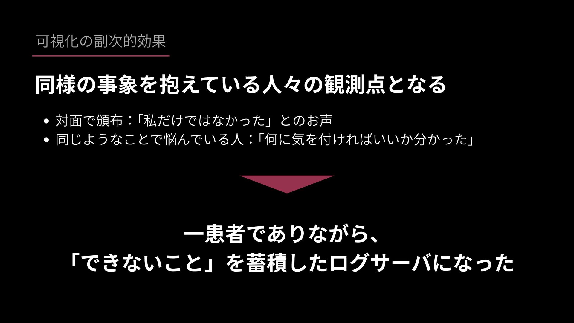 可視化の副次的効果 同様の事象を抱えている人々の観測点となる 対面で頒布: 「私だけではなかった」とのお声 同じようなことで悩んでいる人: 「何に気を付ければいいか分かった」 一患者でありながら、 「できないこと」を蓄積したログサーバになった