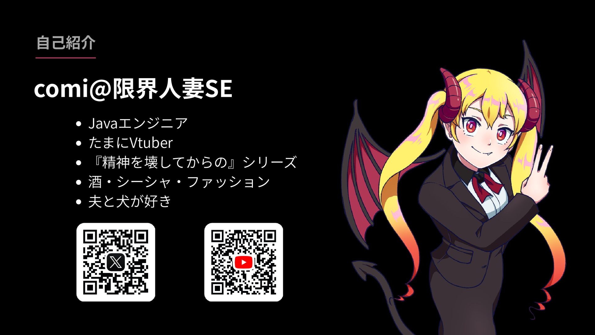 自己紹介 comi@限界人妻SE Javaエンジニア たまにVtuber 『精神を壊してからの』シリーズ 酒・シーシャ・ファッション 夫と犬が好き