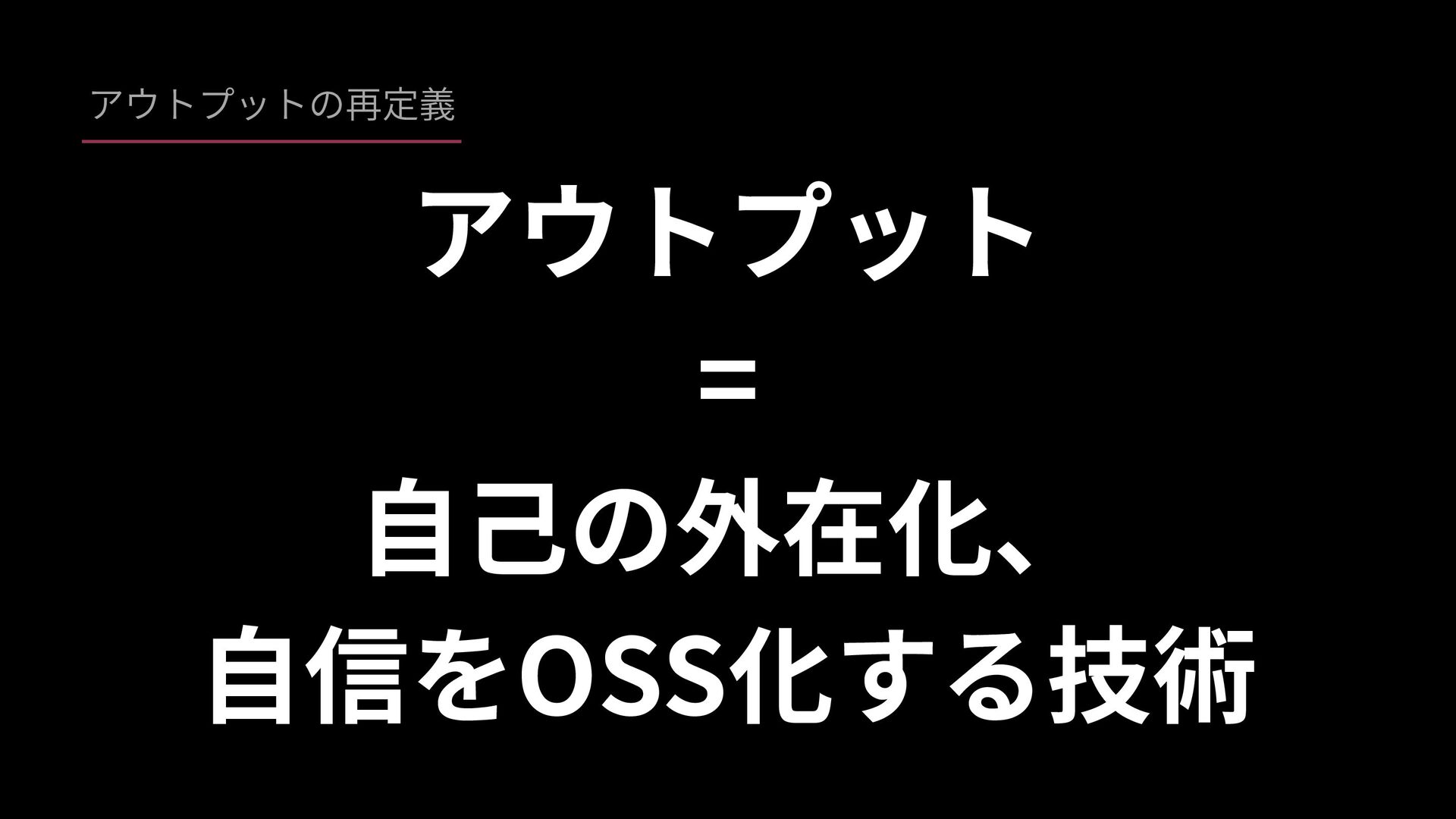 アウトプットの再定義 アウトプット = 自己の外在化、 自信をOSS化する技術