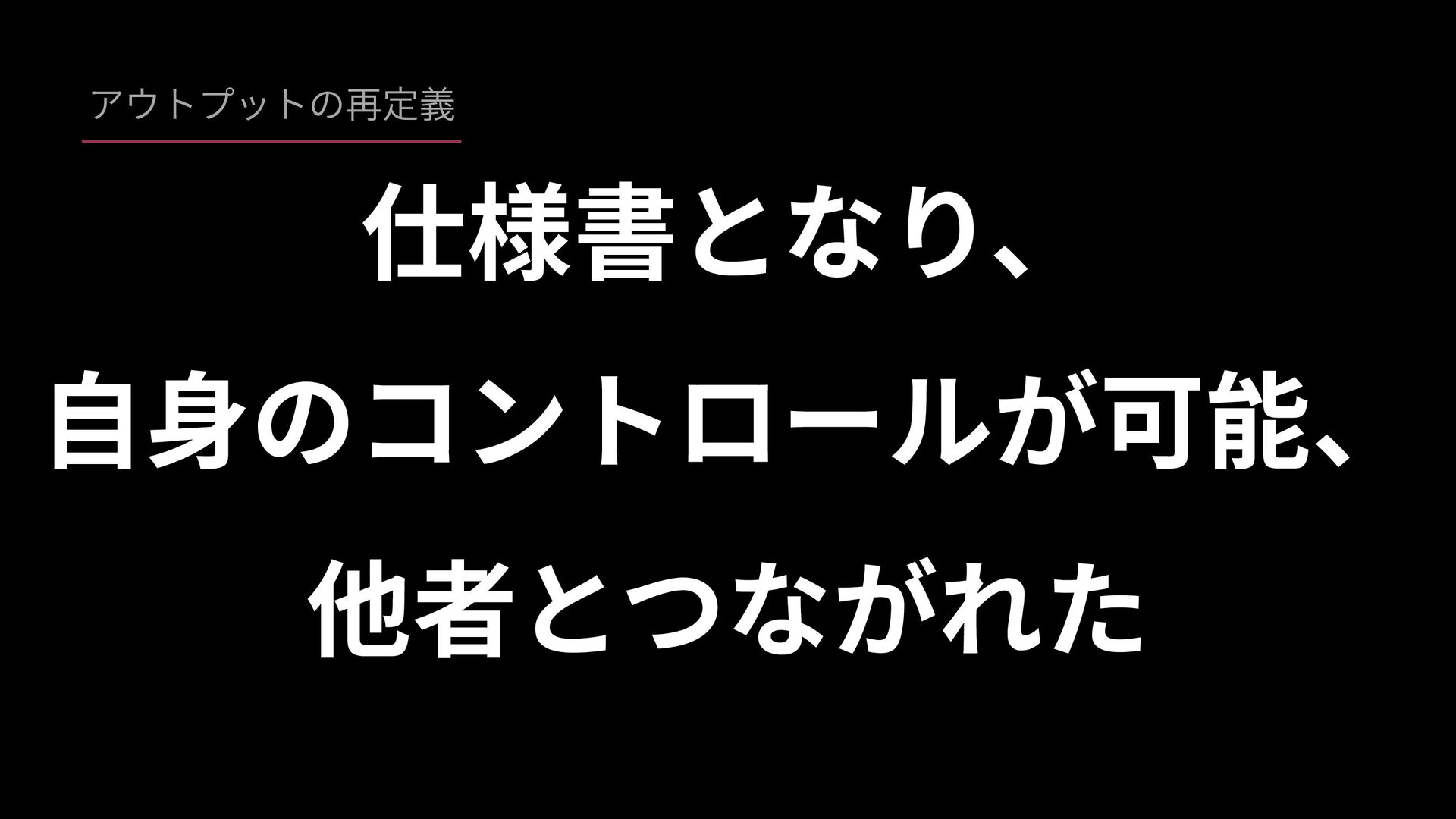 アウトプットの再定義 仕様書となり、 自身のコントロールが可能、 他者とつながれた