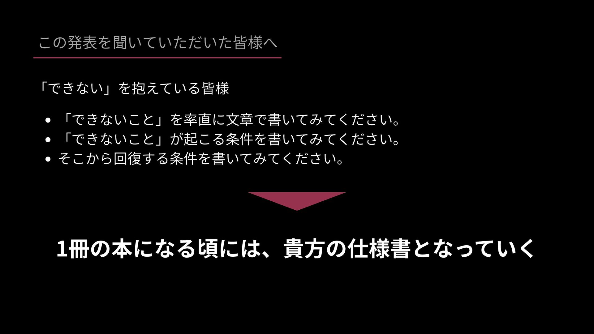 この発表を聞いていただいた皆様へ 1冊の本になる頃には、貴方の仕様書となっていく 「できない」を抱えている皆様 「できないこと」を率直に文章で書いてみてください。 「できないこと」が起こる条件を書いてみてください。 そこから回復する条件を書いてみてください。