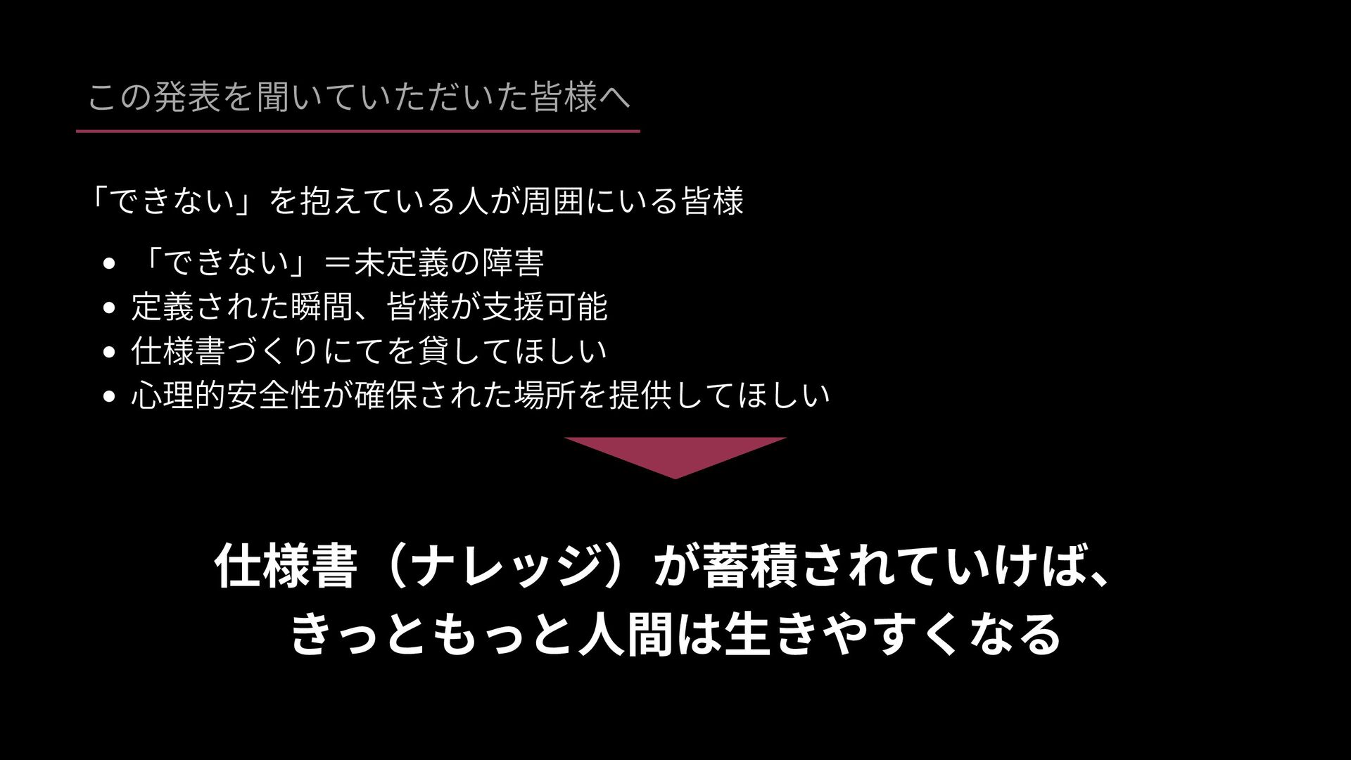 この発表を聞いていただいた皆様へ 仕様書(ナレッジ)が蓄積されていけば、 きっともっと人間は生きやすくなる 「できない」を抱えている人が周囲にいる皆様 「できない」=未定義の障害 定義された瞬間、皆様が支援可能 仕様書づくりにてを貸してほしい 心理的安全性が確保された場所を提供してほしい