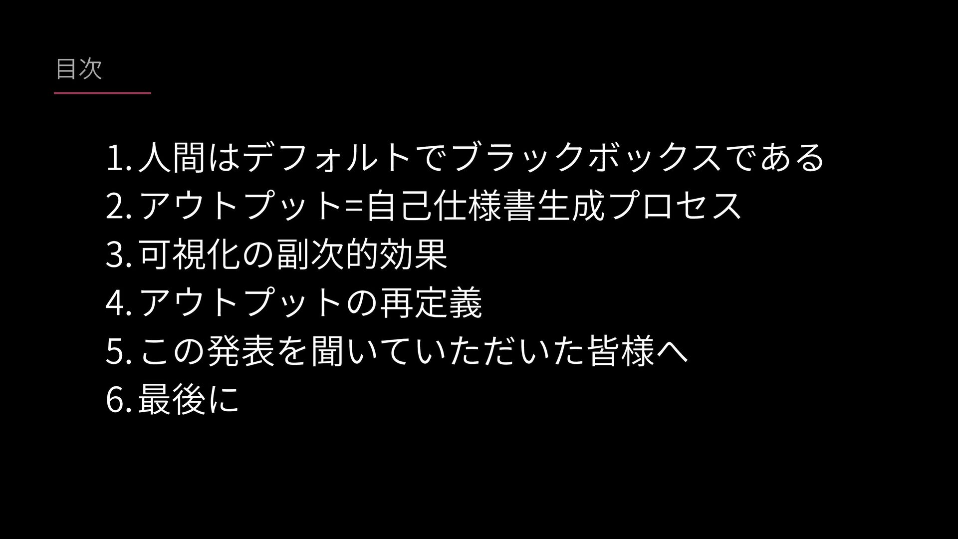 目次 1.人間はデフォルトでブラックボックスである 2.アウトプット=自己仕様書生成プロセス 3.可視化の副次的効果 4.アウトプットの再定義 5.この発表を聞いていただいた皆様へ 6.最後に