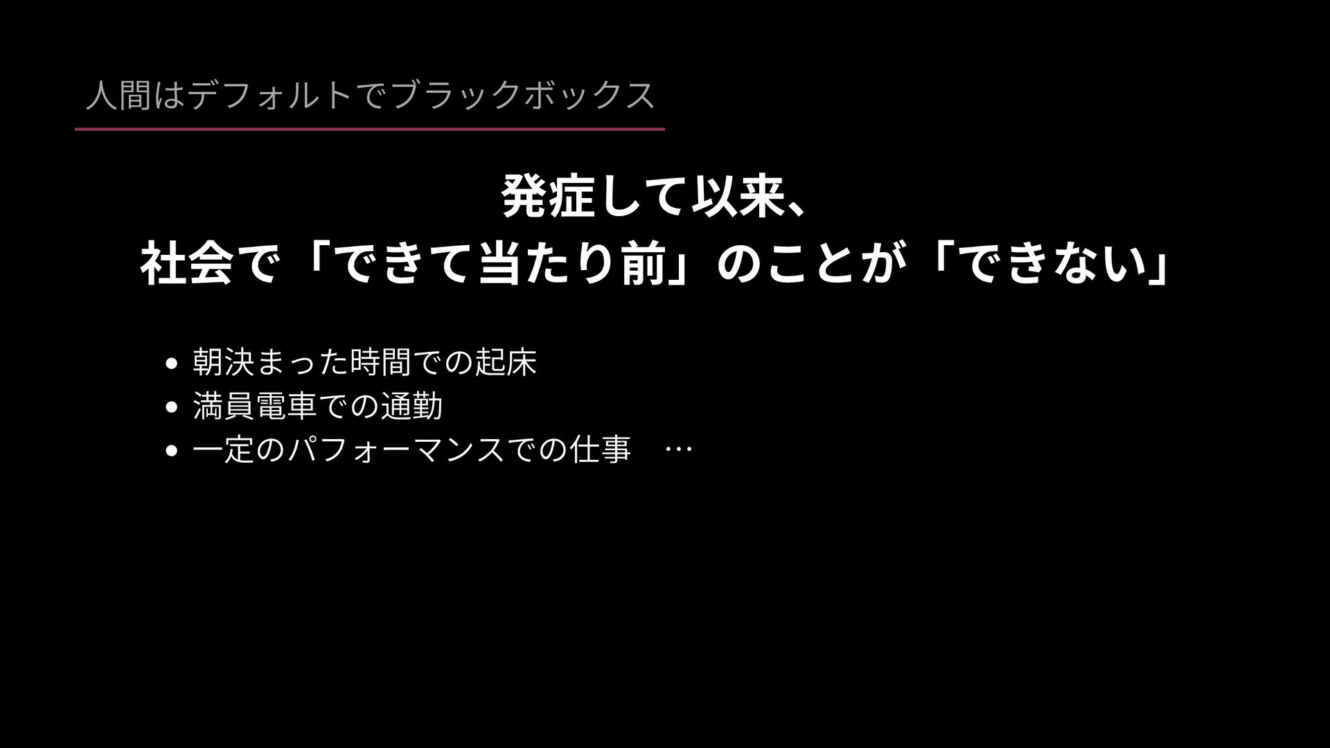 人間はデフォルトでブラックボックス 発症して以来、 社会で「できて当たり前」のことが「できない」 朝決まった時間での起床 満員電車での通勤 一定のパフォーマンスでの仕事 …