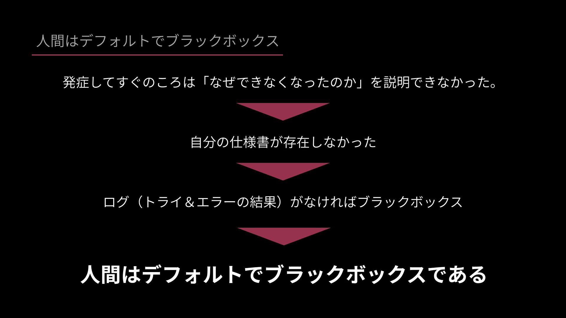 人間はデフォルトでブラックボックス 発症してすぐのころは「なぜできなくなったのか」を説明できなかった。 自分の仕様書が存在しなかった ログ(トライ&エラーの結果)がなければブラックボックス 人間はデフォルトでブラックボックスである