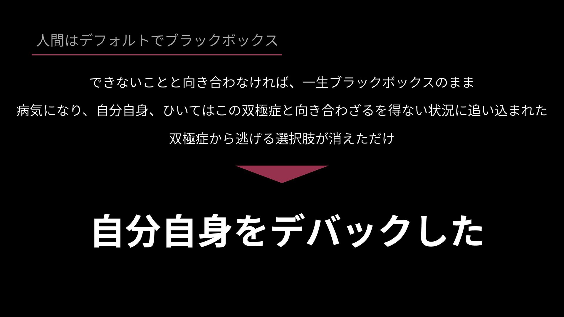 人間はデフォルトでブラックボックス できないことと向き合わなければ、一生ブラックボックスのまま 病気になり、自分自身、ひいてはこの双極症と向き合わざるを得ない状況に追い込まれた 双極症から逃げる選択肢が消えただけ 自分自身をデバックした