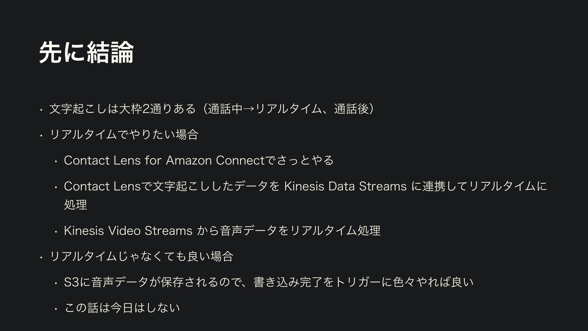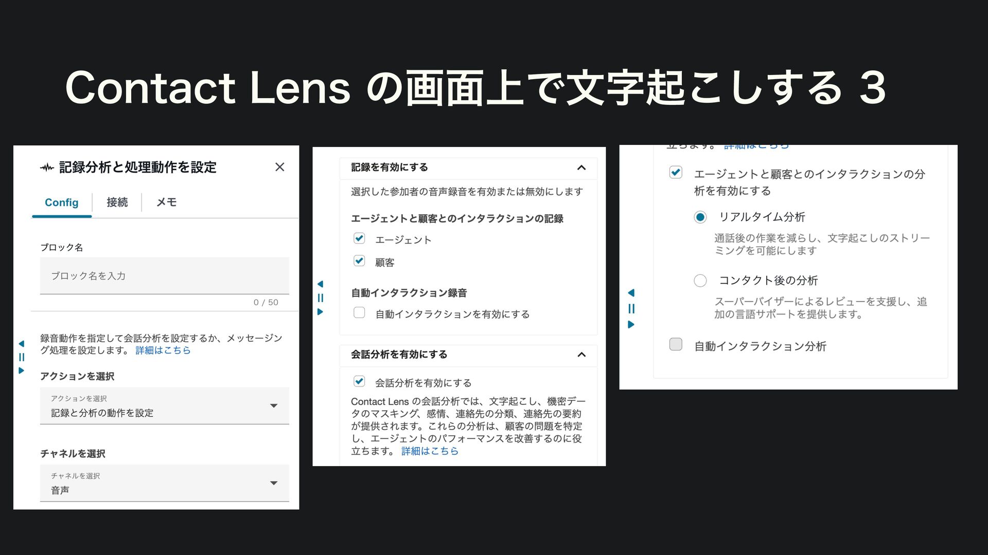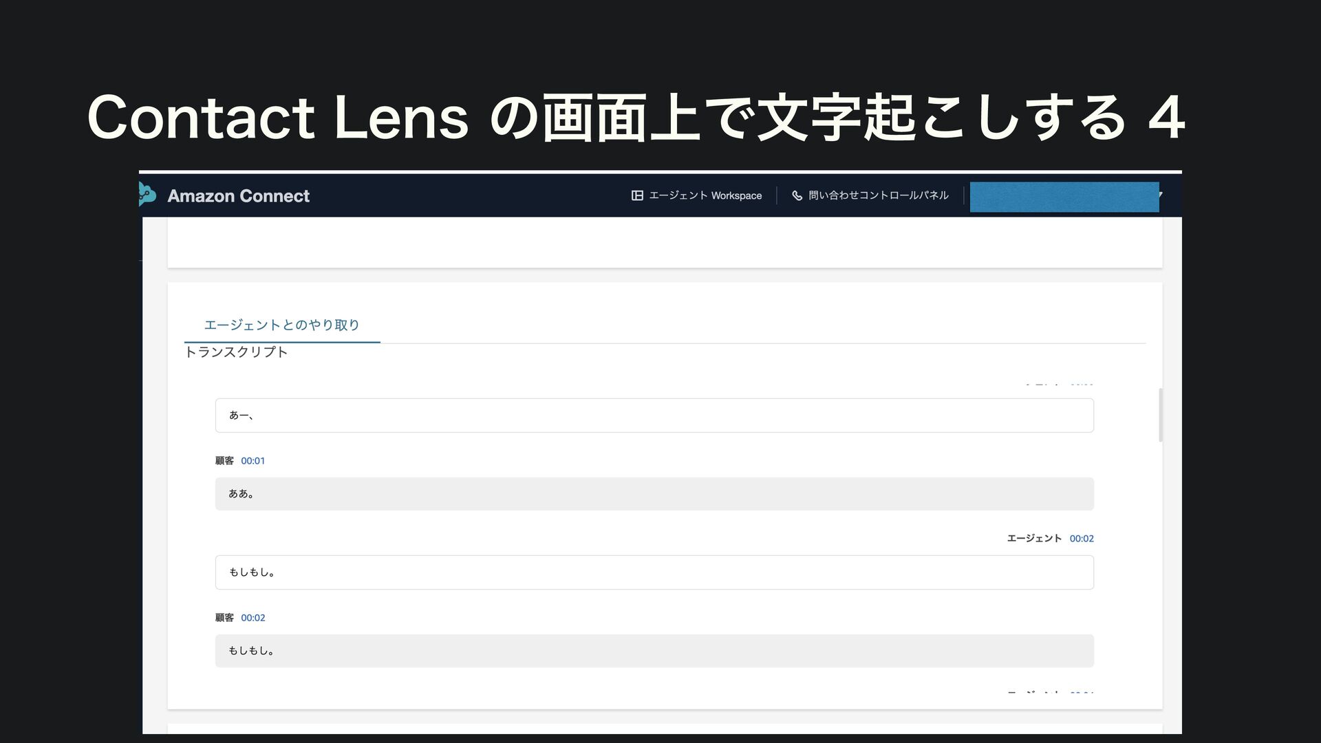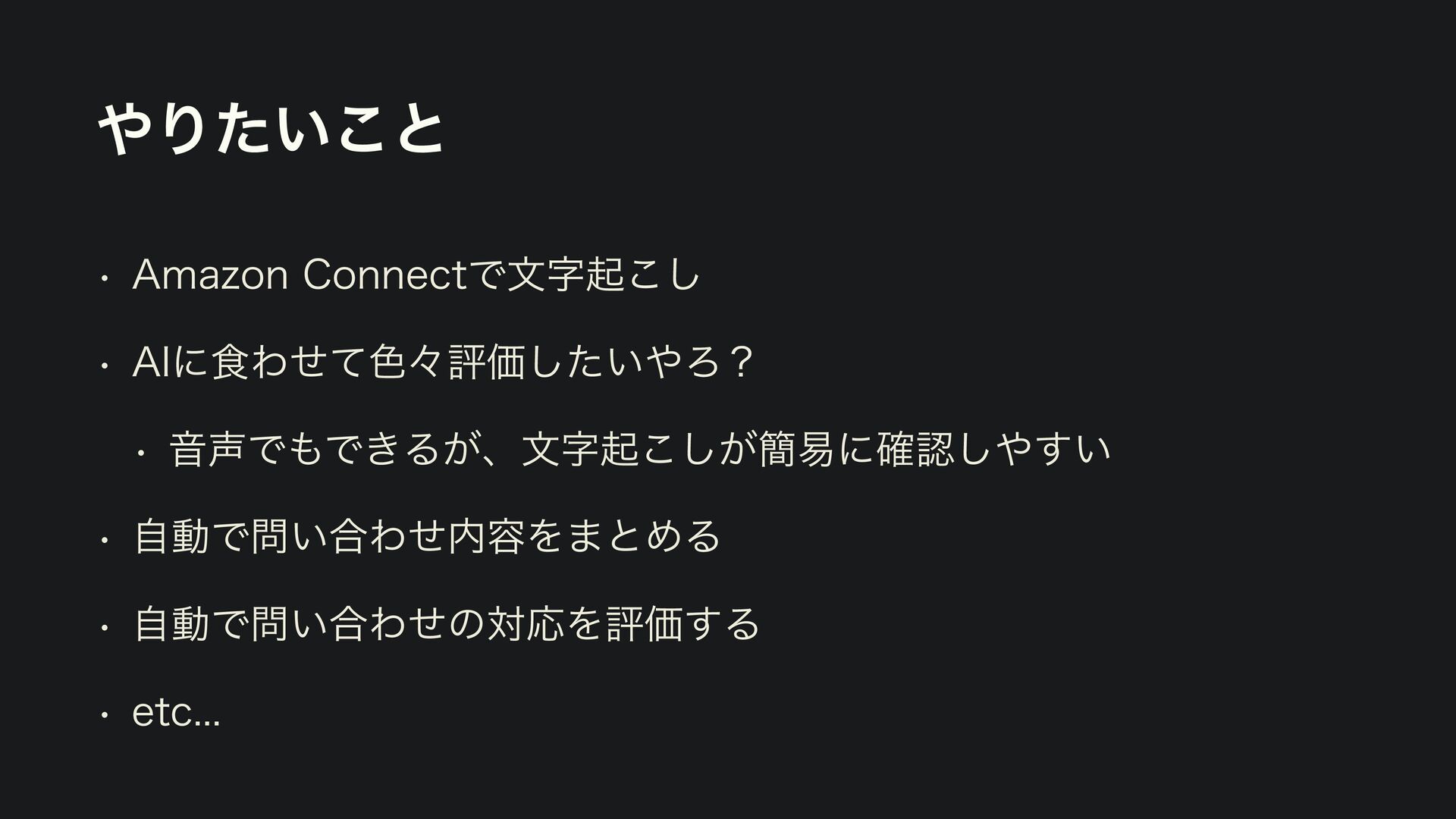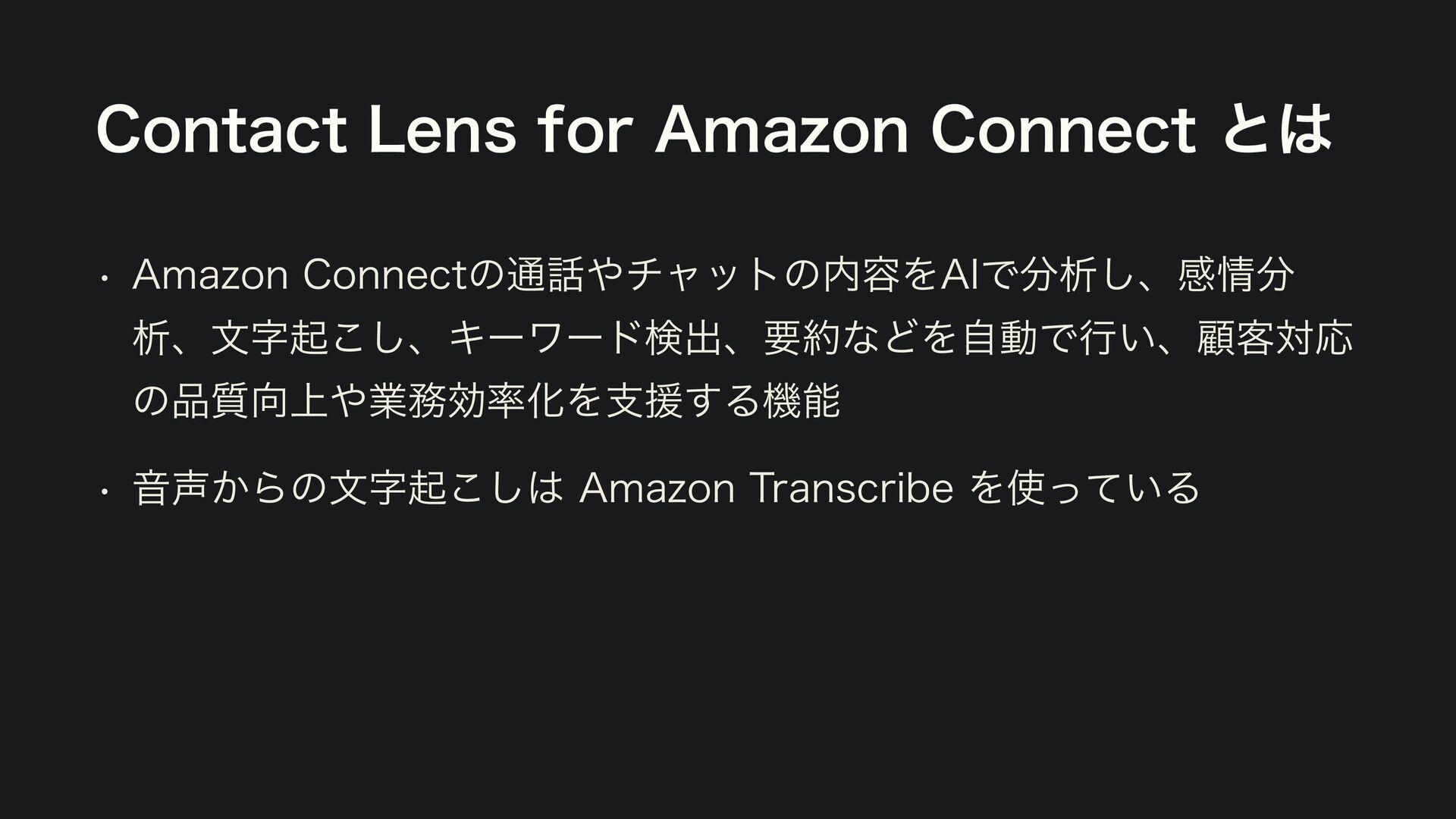 $POUBDU-FOTGPS"NB[PO$POOFDUͱ w "NB[PO$POOFDUͷ௨νϟοτͷ༰Λ"*Ͱੳ͠ɺײ ੳɺจࣈى͜͠ɺΩʔϫʔυݕग़ɺཁͳͲΛࣗಈͰߦ͍ɺސ٬ରԠ ͷ্࣭ۀޮԽΛࢧԉ͢Δػೳ w Ի͔Βͷจࣈى͜͠"NB[PO5SBOTDSJCFΛ͍ͬͯΔ