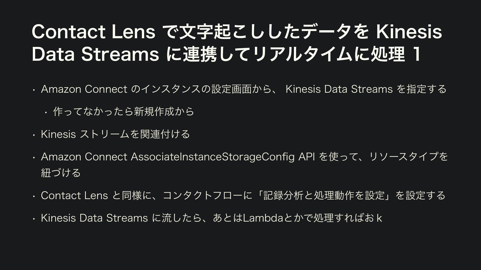 $POUBDU-FOTͰจࣈىͨ͜͠͠σʔλΛ,JOFTJT %BUB4USFBNTʹ࿈ܞͯ͠ϦΞϧλΠϜʹॲཧ w "NB[PO$POOFDUͷΠϯελϯεͷઃఆը໘͔Βɺ,JOFTJT%BUB4USFBNTΛࢦఆ͢Δ w ࡞ͬͯͳ͔ͬͨΒ৽ن࡞͔Β w ,JOFTJTετϦʔϜΛؔ࿈͚Δ w "NB[PO$POOFDU"TTPDJBUF*OTUBODF4UPSBHF$PO