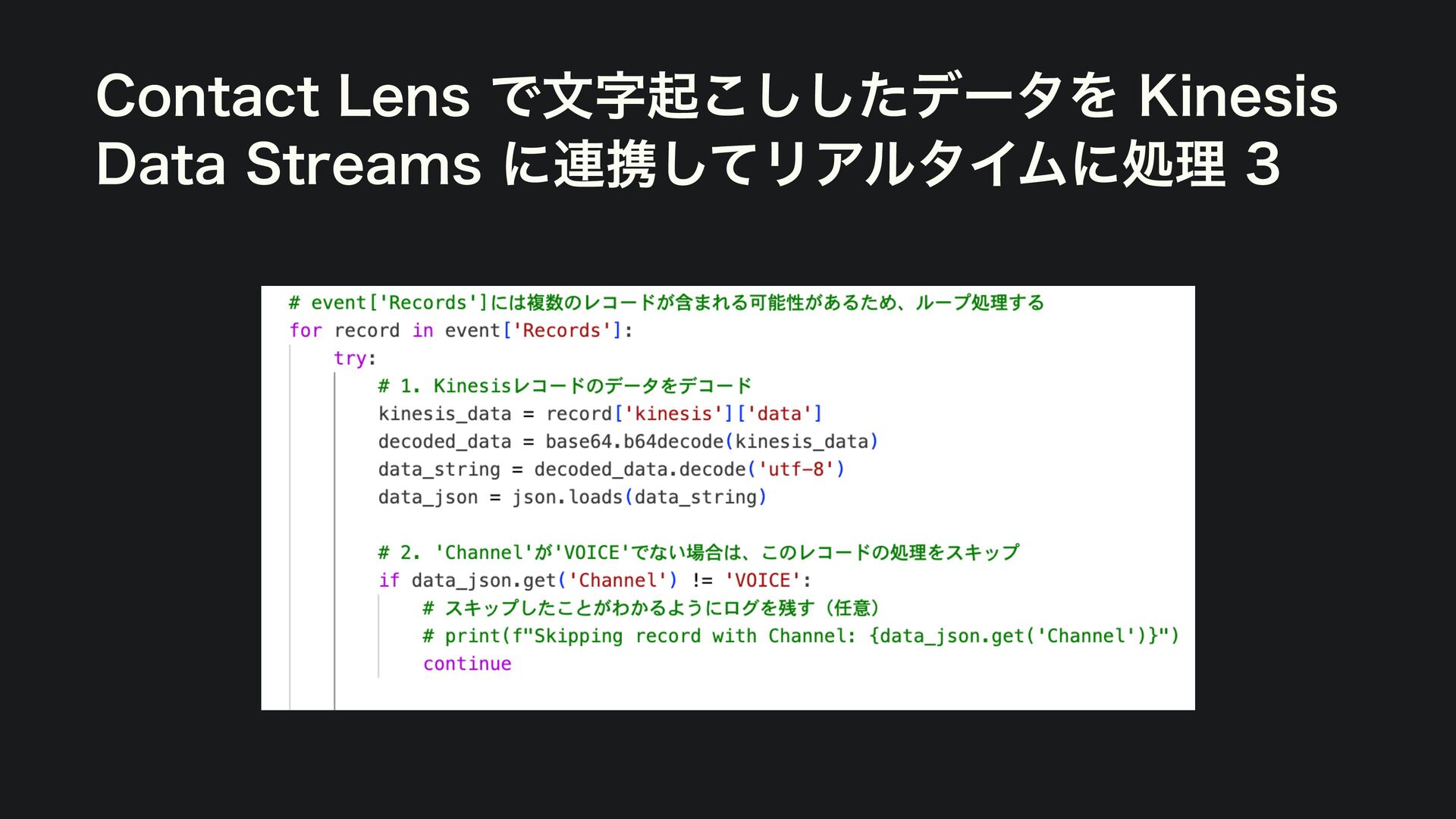 ઌʹ݁ w จࣈى͜͠େ௨Γ͋Δʢ௨தˠϦΞϧλΠϜɺ௨ޙʣ w ϦΞϧλΠϜͰΓ͍ͨ߹ w $POUBDU-FOTGPS"NB[PO$POOFDUͰͬ͞ͱΔ w $POUBDU-FOTͰจࣈىͨ͜͠͠σʔλΛ,JOFTJT%BUB4USFBNTʹ࿈ܞͯ͠ϦΞϧλΠϜʹ ॲཧ