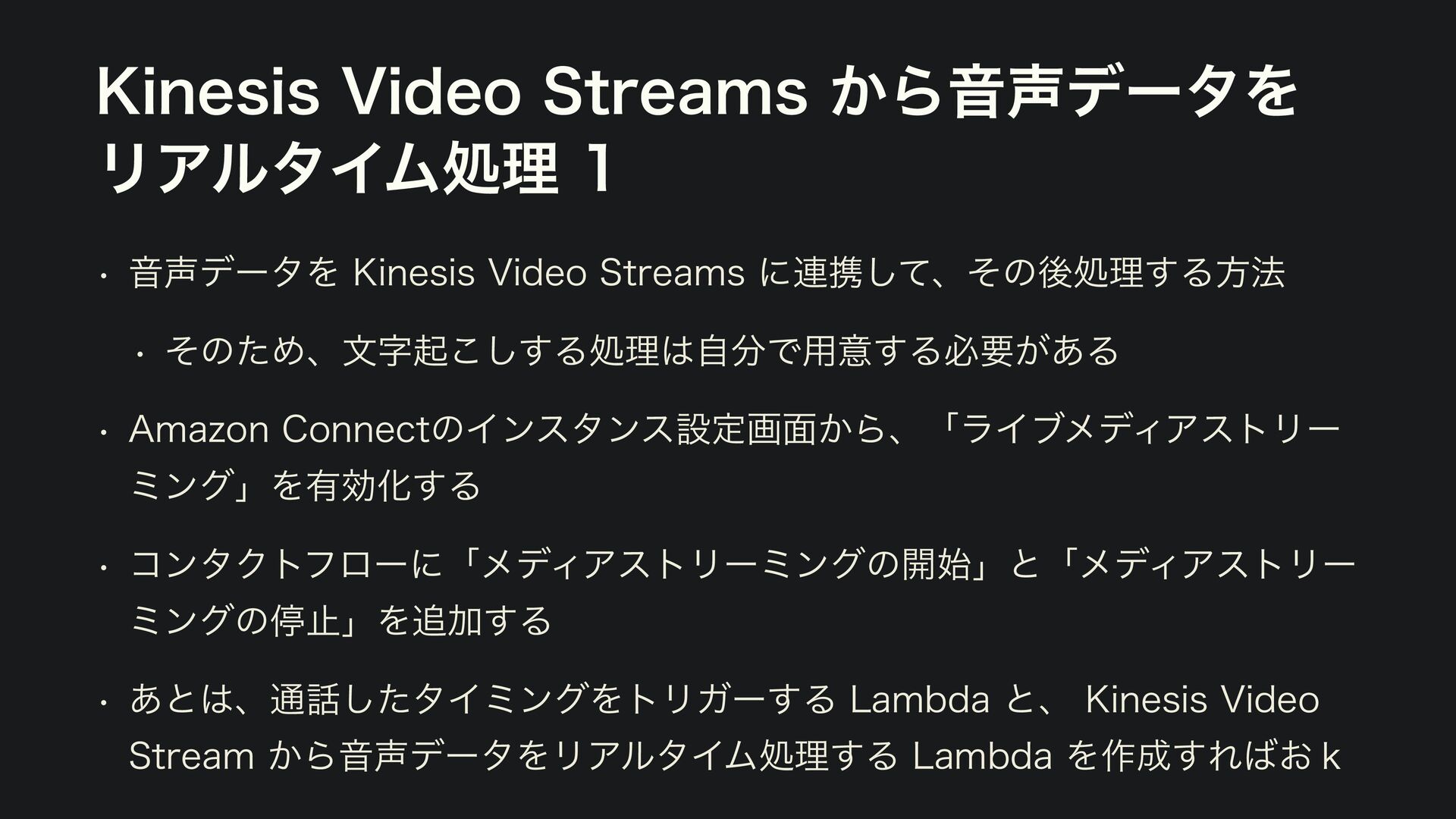 ,JOFTJT7JEFP4USFBNT͔ΒԻσʔλΛ ϦΞϧλΠϜॲཧ w ԻσʔλΛ,JOFTJT7JEFP4USFBNTʹ࿈ܞͯ͠ɺͦͷޙॲཧ͢Δํ๏ w ͦͷͨΊɺจࣈى͜͢͠ΔॲཧࣗͰ༻ҙ͢Δඞཁ͕͋Δ w "NB[PO$POOFDUͷΠϯελϯεઃఆը໘͔ΒɺʮϥΠϒϝσΟΞετϦʔ ϛϯάʯΛ༗ޮԽ͢Δ w