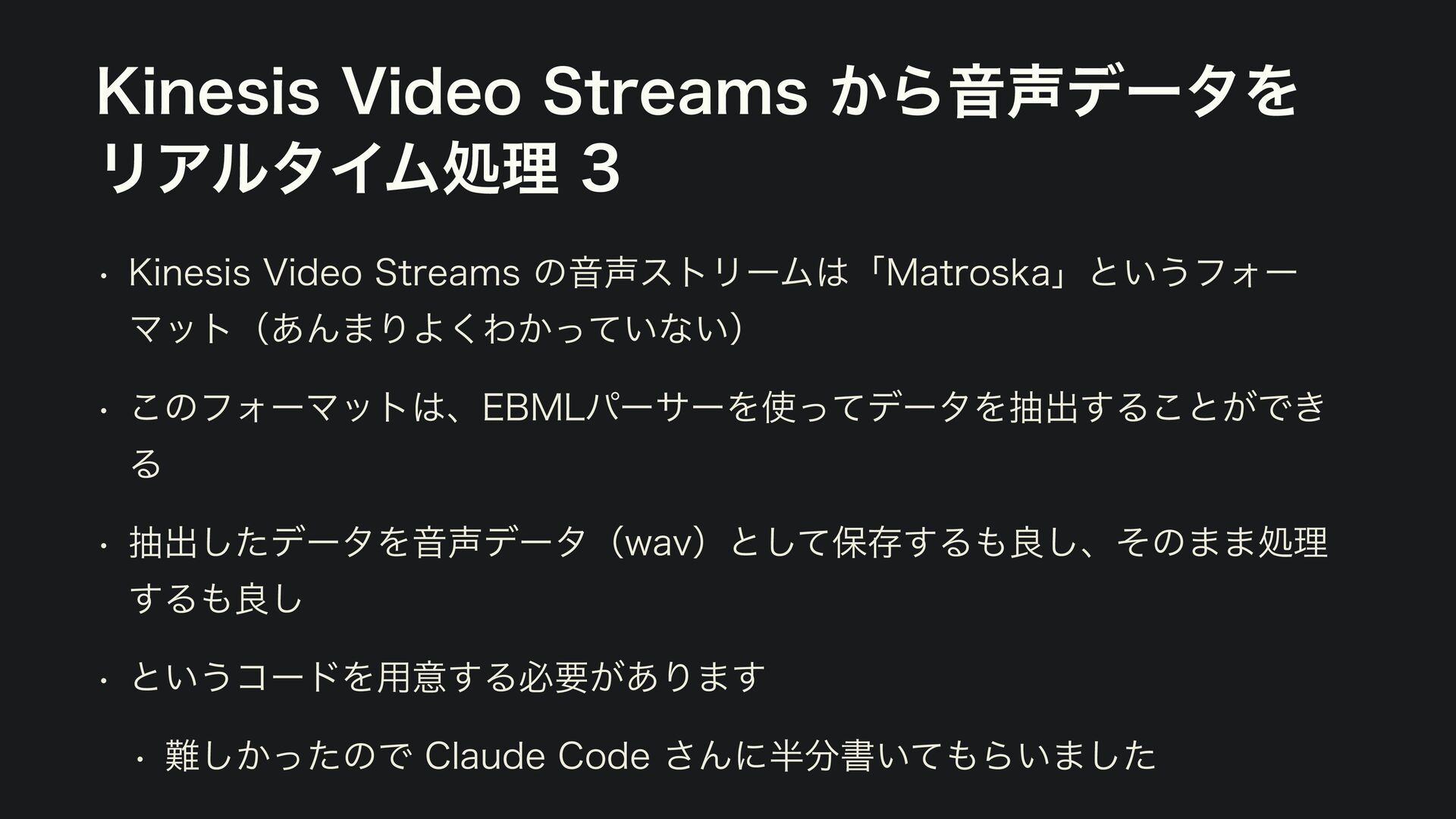 w ,JOFTJT7JEFP4USFBNT͔ΒԻσʔλΛϦΞϧλΠϜॲཧ w ϦΞϧλΠϜ͡Όͳͯ͘ྑ͍߹ w 4ʹԻσʔλ͕อଘ͞ΕΔͷͰɺॻ͖ࠐΈྃΛτϦΨʔʹ৭ʑΕྑ͍ w ͜ͷࠓ͠ͳ͍