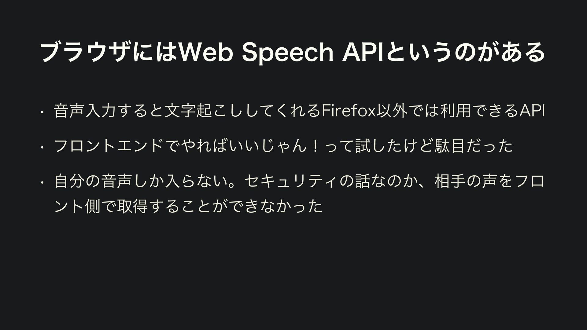 ϒϥβʹ8FC4QFFDI"1*ͱ͍͏ͷ͕͋Δ w Իೖྗ͢Δͱจࣈىͯ͘͜͠͠ΕΔ'JSFGPYҎ֎Ͱར༻Ͱ͖Δ"1* w ϑϩϯτΤϯυͰΕ͍͍͡ΌΜʂͬͯࢼ͚ͨ͠Ͳବͩͬͨ w ࣗͷԻ͔͠ೖΒͳ͍ɻηΩϡϦςΟͷͳͷ͔ɺ૬खͷΛϑϩ ϯτଆͰऔಘ͢Δ͜ͱ͕Ͱ͖ͳ͔ͬͨ