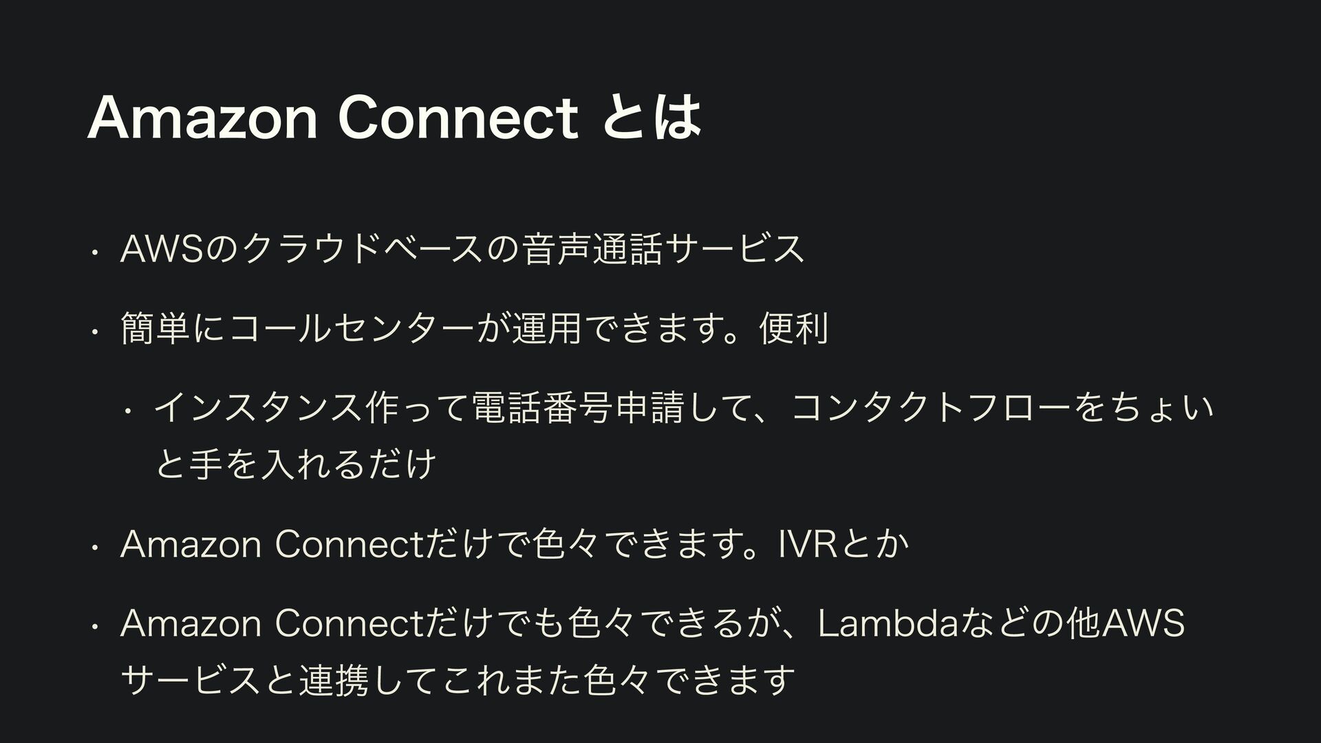 "NB[PO$POOFDUͱ w "84ͷΫϥυϕʔεͷԻ௨αʔϏε w ؆୯ʹίʔϧηϯλʔ͕ӡ༻Ͱ͖·͢ɻศར w Πϯελϯε࡞ͬͯి൪߸ਃͯ͠ɺίϯλΫτϑϩʔΛͪΐ͍ ͱखΛೖΕΔ͚ͩ w "NB[PO$POOFDU͚ͩͰ৭ʑͰ͖·͢ɻ*73ͱ͔