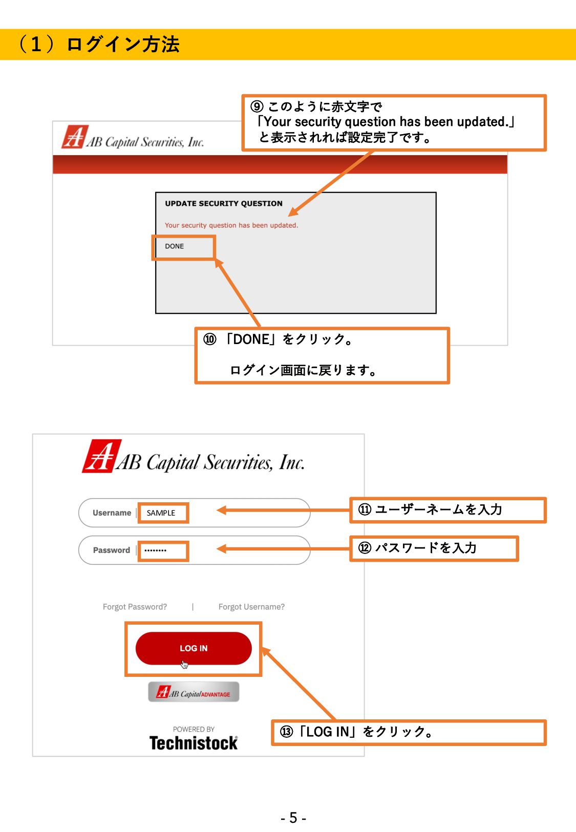 設定画⾯に遷移します。 ⑥ デフォルトの状態では 「What is your motherʼs maiden name ? (あなたの⺟親の旧姓は?)」と表⽰されています。 (他の質問を選択することも可能ですがここでは割愛します。) SAMPLE suzuki ⑦ 質問の答えとして設定するものを アルファベットで⼊⼒。 (⼤⽂字⼩⽂字どちらでも構いません。) ★この設定は初回のみです。 なお、秘密の質問は、パスワードを忘れた場合など、 アカウントの本⼈確認のために必要となります。 忘れないよう必ずメモをお取りください。 ⑧ 「DONE」をクリック。 - 4 -