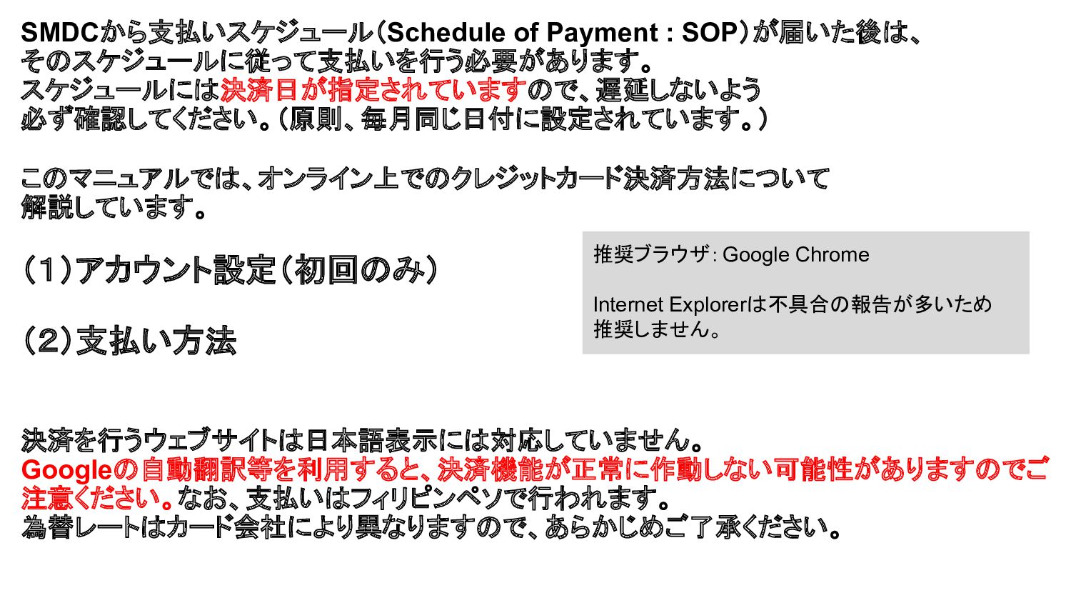 SMDCから支払いスケジュール(Schedule of Payment : SOP)が届いた後は、 そのスケジュールに従って支払いを行う必要があります。 スケジュールには決済日が指定されていますので、遅延しないよう 必ず確認してください。(原則、毎月同じ日付に設定されています。) このマニュアルでは、オンライン上でのクレジットカード決済方法について 解説しています。