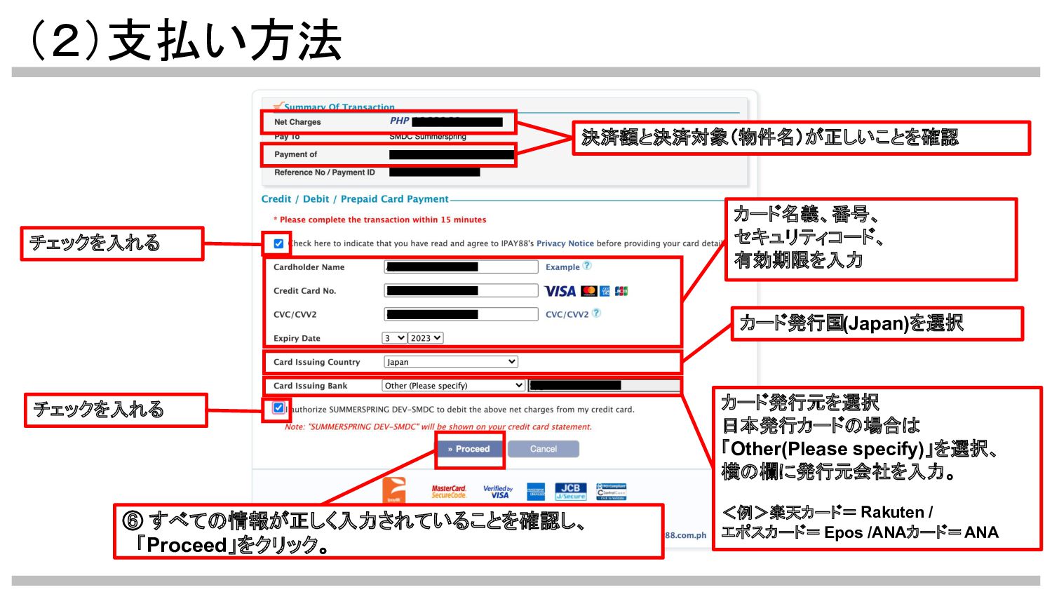 (2)支払い方法 ⑥ すべての情報が正しく入力されていることを確認し、 「Proceed」をクリック。 決済額と決済対象(物件名)が正しいことを確認 チェックを入れる カード名義、番号、 セキュリティコード、 有効期限を入力 カード発行国(Japan)を選択