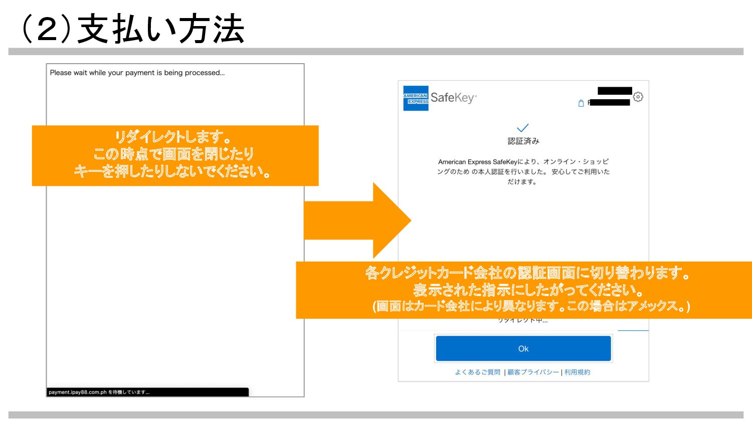 (2)支払い方法 リダイレクトします。 この時点で画面を閉じたり キーを押したりしないでください。 各クレジットカード会社の認証画面に切り替わります。 表示された指示にしたがってください。 (画面はカード会社により異なります。この場合はアメックス。)