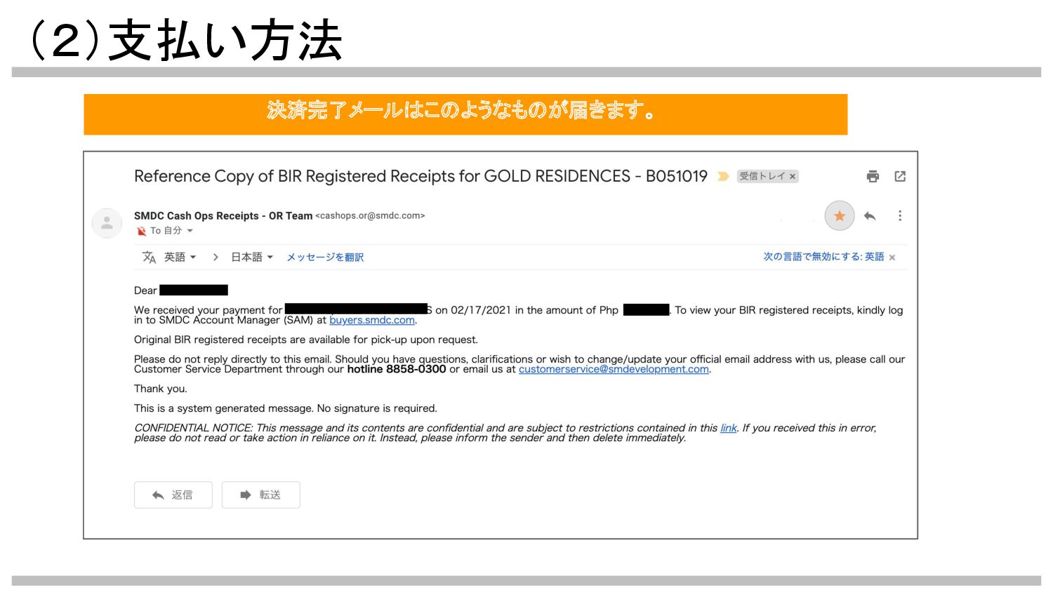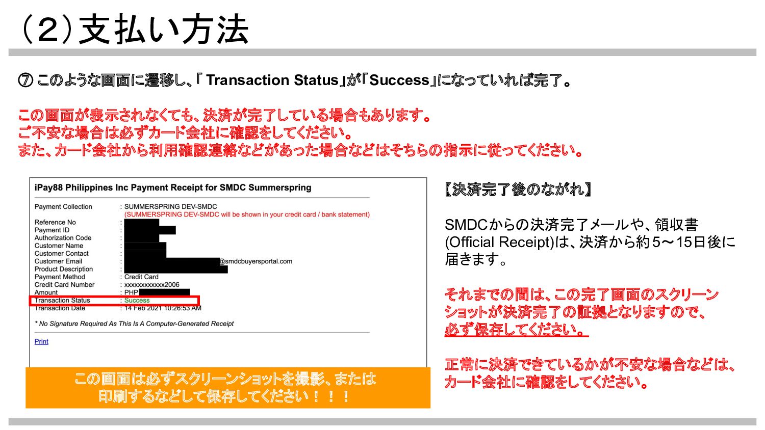 【決済完了後のながれ】 SMDCからの決済完了メールや、領収書 (Official Receipt)は、決済から約5〜15日後に 届きます。 それまでの間は、この完了画面のスクリーン ショットが決済完了の証拠となりますので、 必ず保存してください。 正常に決済できているかが不安な場合などは、 カード会社に確認をしてください。
