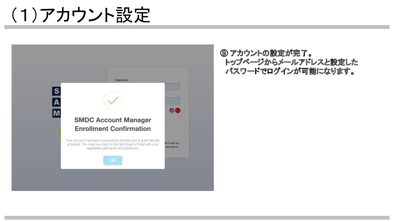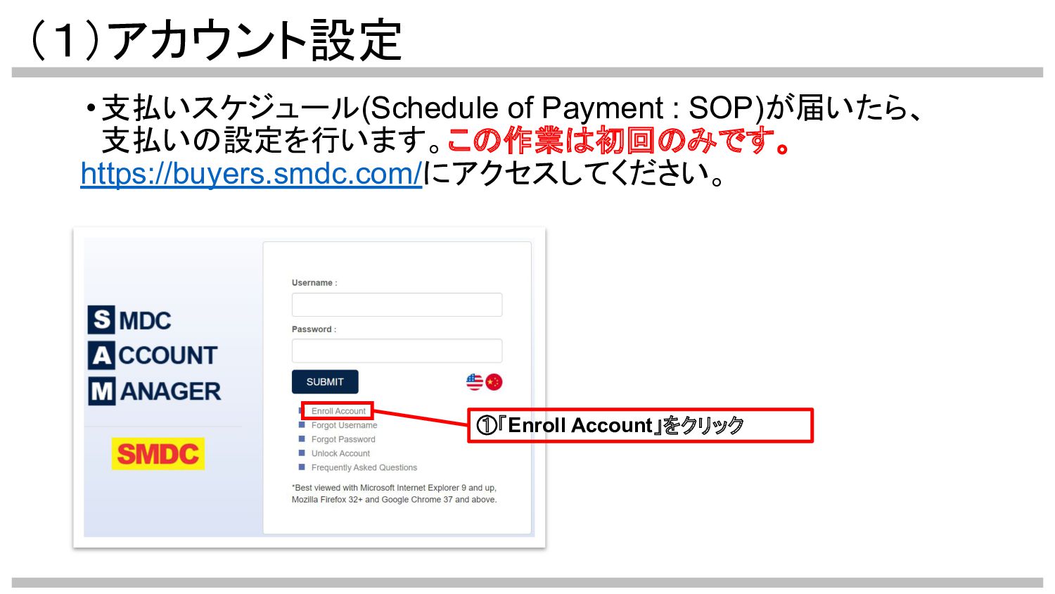 (1)アカウント設定 •支払いスケジュール(Schedule of Payment : SOP)が届いたら、 支払いの設定を行います。この作業は初回のみです。 https://buyers.smdc.com/にアクセスしてください。 ①「Enroll Account」をクリック