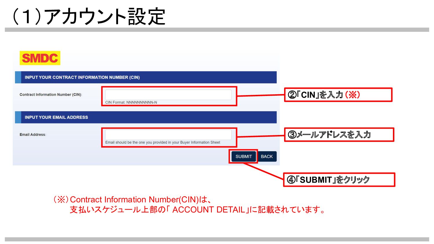 (1)アカウント設定 ②「CIN」を入力(※) (※)Contract Information Number(CIN)は、 支払いスケジュール上部の「 ACCOUNT DETAIL」に記載されています。 ③メールアドレスを入力 ④「SUBMIT」をクリック