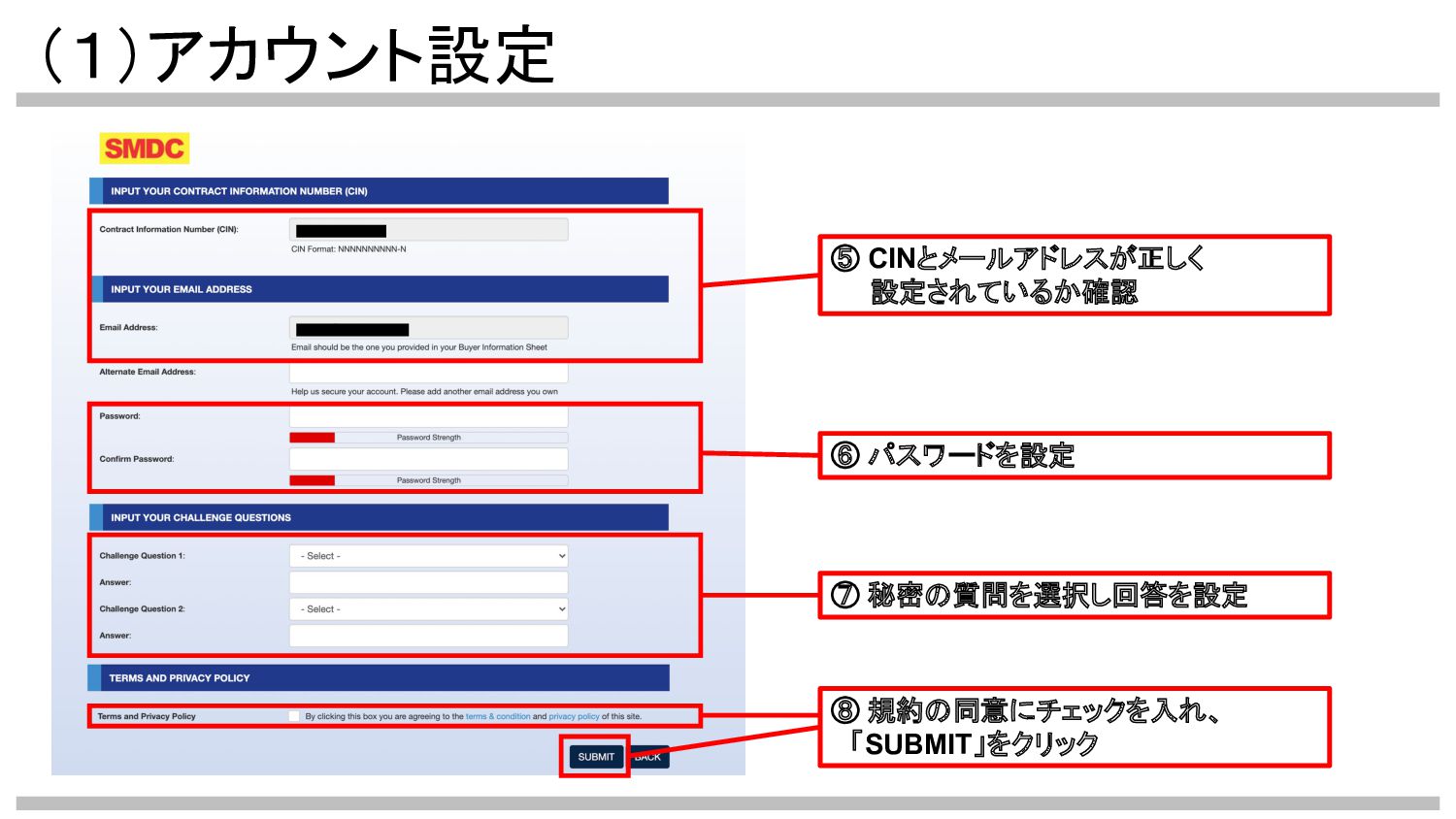 (1)アカウント設定 ⑤ CINとメールアドレスが正しく 設定されているか確認 ⑥ パスワードを設定 ⑦ 秘密の質問を選択し回答を設定 ⑧ 規約の同意にチェックを入れ、