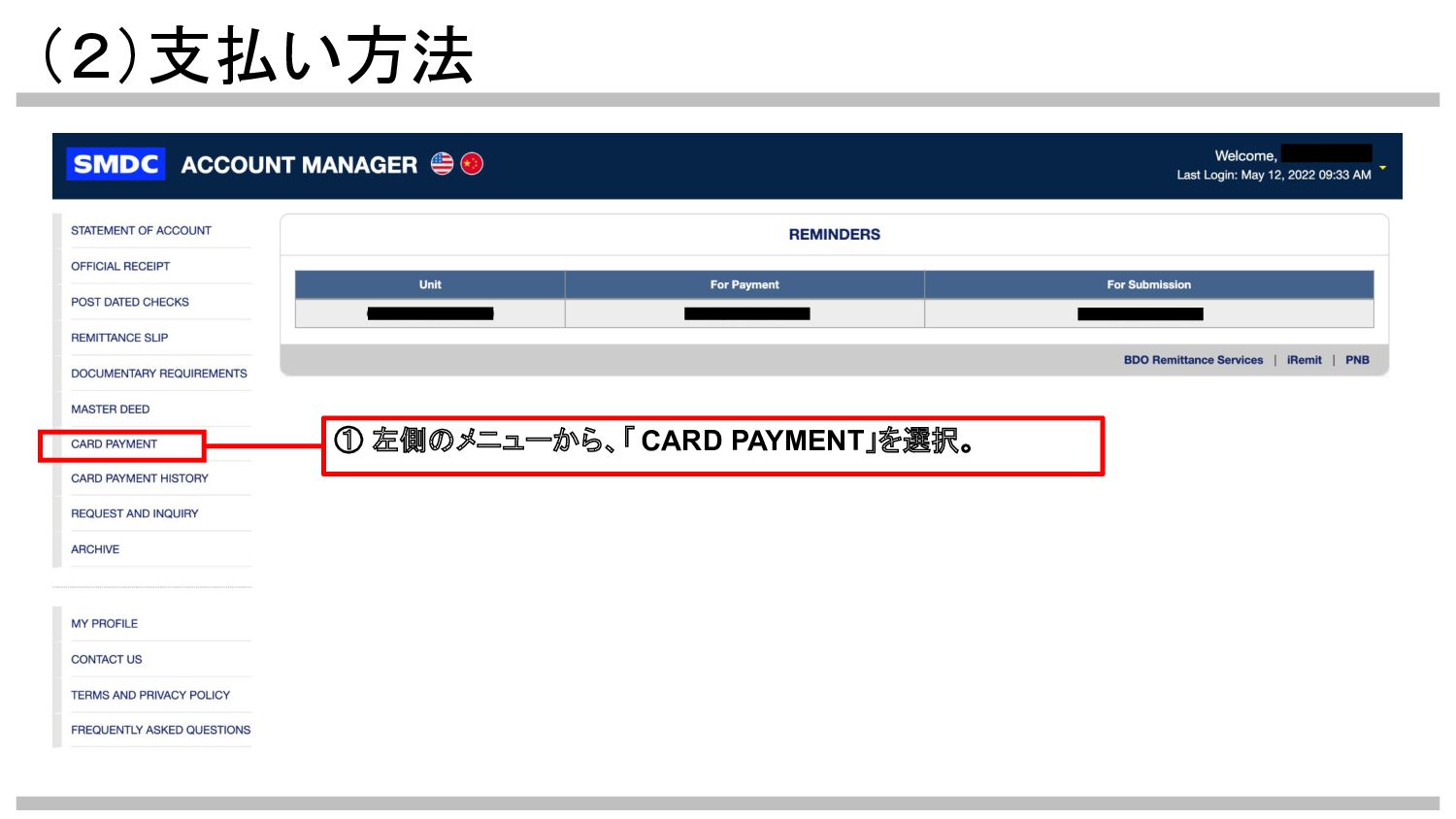 (2)支払い方法 ① 左側のメニューから、「 CARD PAYMENT」を選択。