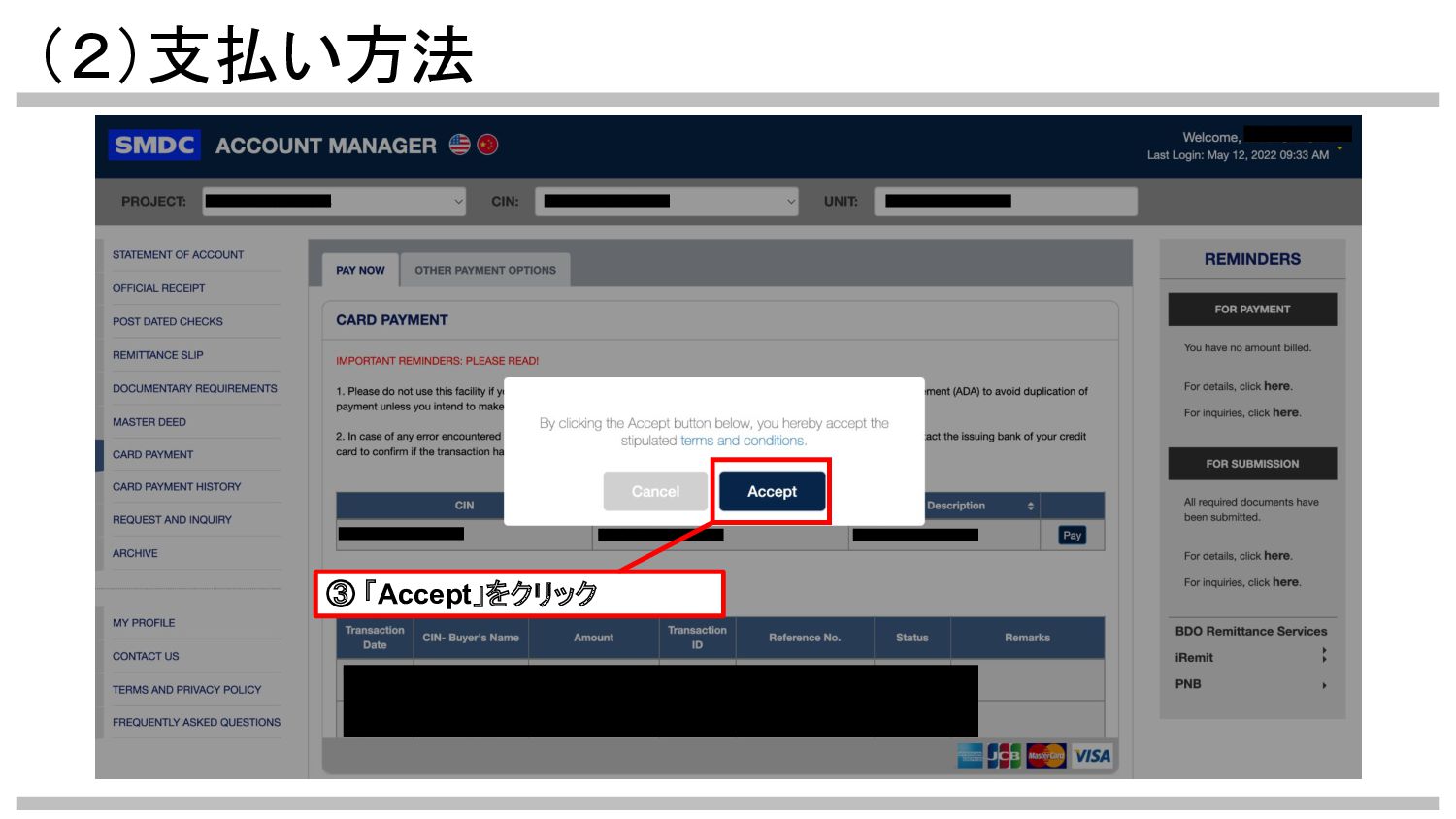 (2)支払い方法 ③ 「Accept」をクリック