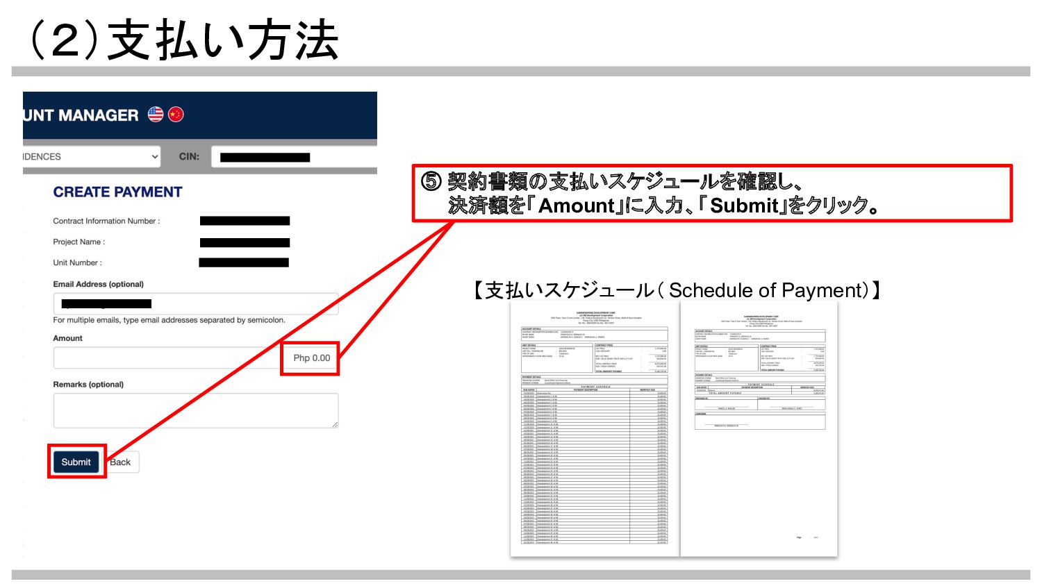 (2)支払い方法 ⑤ 契約書類の支払いスケジュールを確認し、 決済額を「Amount」に入力、「Submit」をクリック。 【支払いスケジュール( Schedule of Payment)】