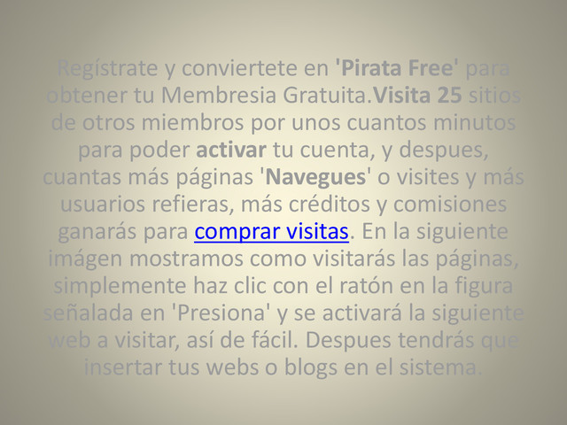 Gratuita.Visita 25 sitios de otros miembros por unos cuantos minutos para poder activar tu cuenta, y despues, cuantas más páginas 'Navegues' o visites y más usuarios refieras, más créditos y comisiones ganarás para comprar visitas. En la siguiente imágen mostramos como visitarás las páginas, simplemente haz clic con el ratón en la figura señalada en 'Presiona' y se activará la siguiente web a visitar, así de fácil. Despues tendrás que insertar tus webs o blogs en el sistema.