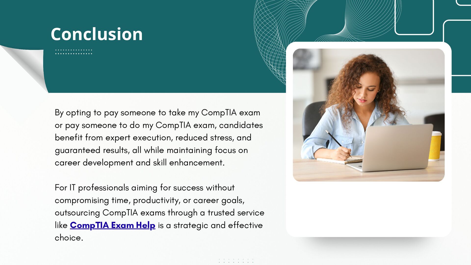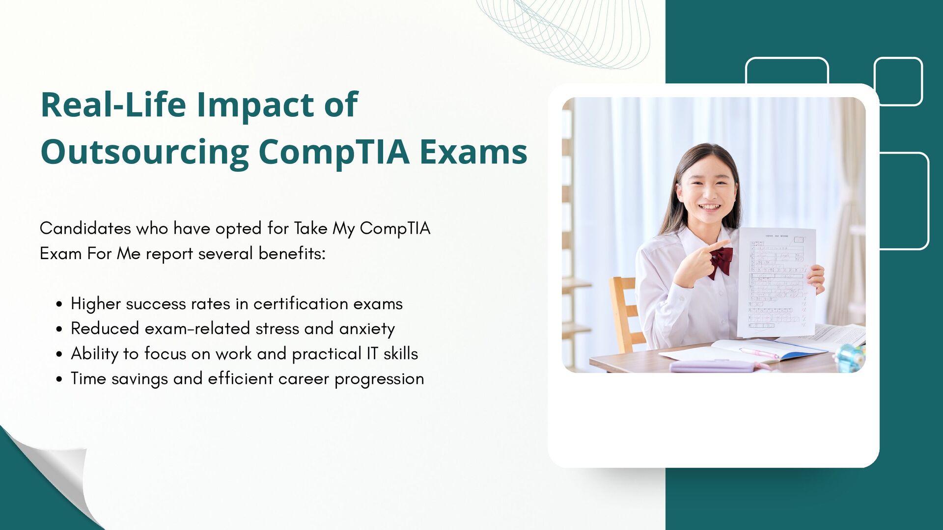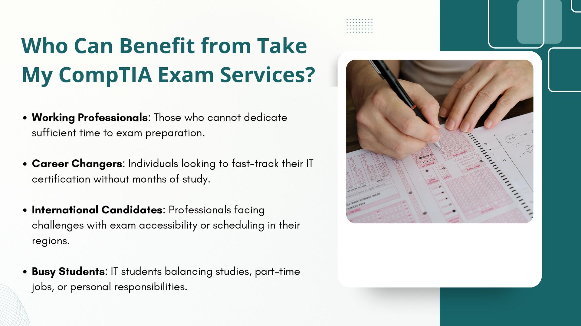 Boost your certification success with our Take My CompTIA Exam For Me services. Get expert help to manage your exams securely and efficiently. Achieve top results without stress as professionals handle your CompTIA test with precision, ensuring accuracy, reliability, and complete confidentiality for your certification journey. Get a Free Quote - https://comptiaexamhelp.com/