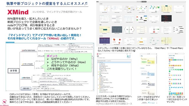 想いが先走ってうまく相手に伝えれないことありませんか? 「マインドマップ」でアイデアや想いを洗い出し!視覚化! それを手助けしてくれるツール「XMind」の紹介です。 XMind ※いわゆる、マインドマップ作成手助けツール ⇧テンプレートが豊富!仕事に役立つテンプレはもちろん、「Diet Plan」や「Travel Plan」 なんてものも!色々な用途に使えそう✨ ⇧エクスポートはあまり潤沢ではない。 無料だとHTMLファイルや画像など、 課金すれば色々な形式で出せる。 ※[Pro]と表記されてるのは課金コース ⇧テーマも好きなデザイ ンが選べるので楽しい ⇧マーカーを使って 一目でわかるマインド マップに ロボットにはできない「思考」を手助けするためのツールです。 自動化はできないけど、効率化ツールの1つとしてどこかで活用してみてください。 無料でダウンロードして使えるけど、使いたい機能はPro版(有料)の方が多いです。 無料でどこまでやれるか、皆さんの実践結果も教えてください!