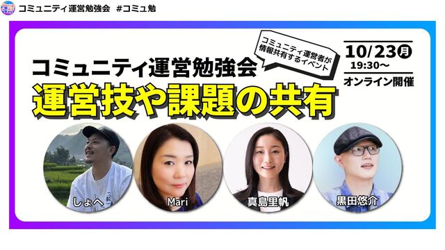 コミュニティ運営勉強会 #コミュ勉 様々なコミュニティ推進者 トレンド情報 満載なひと イベント企画 得意なひと イベント進行 得意なひと オンライン