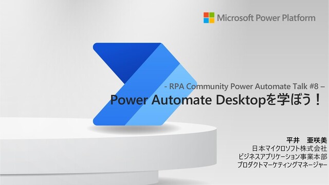 2015 年 2016 年 2017 年 2018 年 2019 年 2020 年 製品を エンタープライズ向けに刷 新 ProcessRobot の ローンチ Forrester、Gartner、 Everest から 「トップ RPA ベンダー」として 認められる (有人/無人のデスクトップ フロー) • マイクロソフトが Softomotive を買収 • Power Automate Desktop (一般提供) • Process Advisor (パブ リック プレビュー) 150 超のグローバル パートナーを獲得 Softomotive が グローバル オフィスを開設 2005 年 Softomotive がギリシャで創業 350,000 以上 毎月の Power Automate 利用組織数 2008 年 WinAutomation をローンチ Softomotive