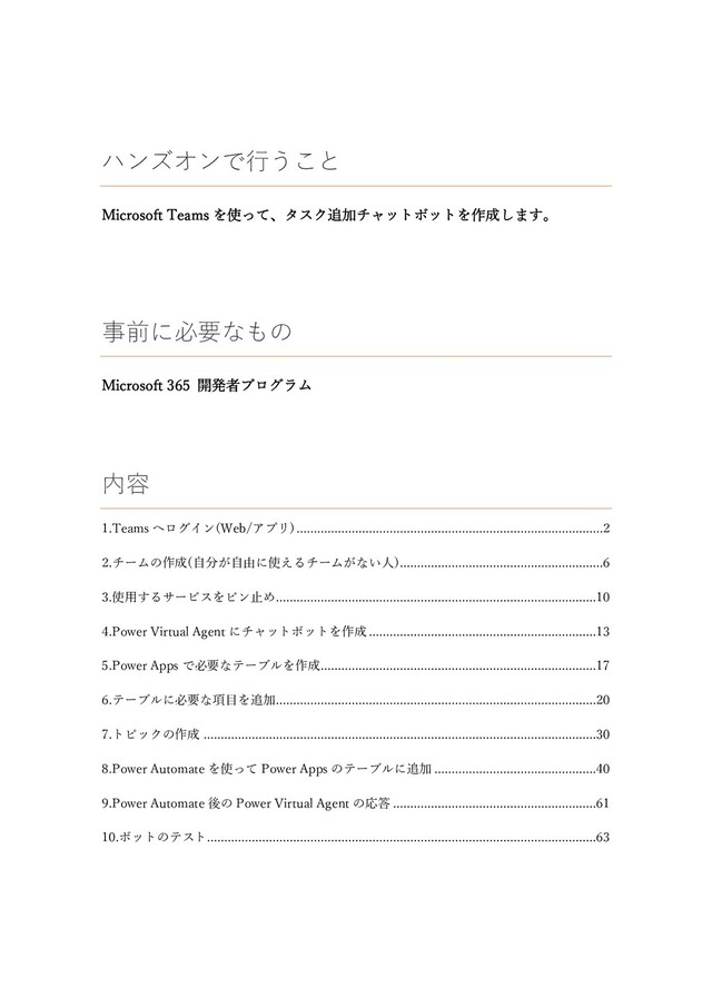 へログイン(Web/アプリ) ......................................................................................... 2 2.チームの作成(自分が自由に使えるチームがない人) ........................................................... 6 3.使用するサービスをピン止め ............................................................................................. 10 4.Power Virtual Agent にチャットボットを作成 .................................................................. 13 5.Power Apps で必要なテーブルを作成 ................................................................................ 17 6.テーブルに必要な項目を追加 ............................................................................................. 20 7.トピックの作成 .................................................................................................................. 30 8.Power Automate を使って Power Apps のテーブルに追加 ............................................... 40 9.Power Automate 後の Power Virtual Agent の応答 ........................................................... 61 10.ボットのテスト................................................................................................................. 63