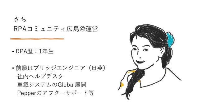 • RPA歴:1年生 • 前職はブリッジエンジニア(日英) 社内ヘルプデスク 車載システムのGlobal展開 Pepperのアフターサポート等 さち RPAコミュニティ広島@運営