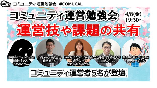 コミュニティ運営勉強会 #COMUCAL 現場の コミュニティ運営スキルを 学ぶ!共有する!