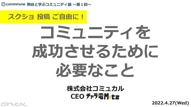 コミュニティを 成功させるために 必要なこと 2022.4.27(Wed) 株式会社コミュカル 駒谷と学ぶコミュニティ論 ~第1回~ スクショ 投稿 ご自由に!