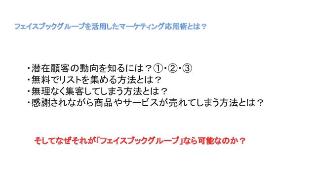 ・無料でリストを集める方法とは? ・無理なく集客してしまう方法とは? ・感謝されながら商品やサービスが売れてしまう方法とは? そしてなぜそれが「フェイスブックグループ」なら可能なのか?