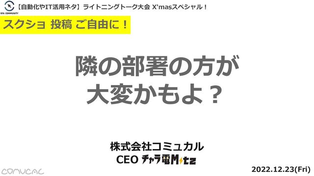 隣の部署の方が 大変かもよ? 2022.12.23(Fri) 株式会社コミュカル CEO 【自動化やIT活用ネタ】ライトニングトーク大会 X'masスペシャル! スクショ 投稿 ご自由に!