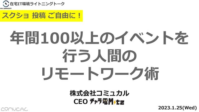 年間100以上のイベントを 行う人間の リモートワーク術 2023.1.25(Wed) 株式会社コミュカル CEO 在宅IT環境ライトニングトーク スクショ 投稿 ご自由に!
